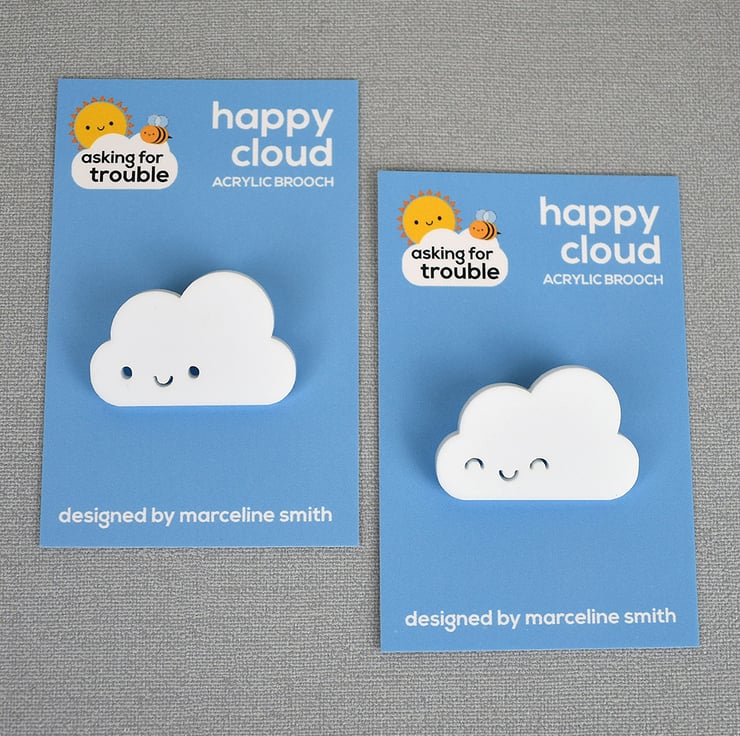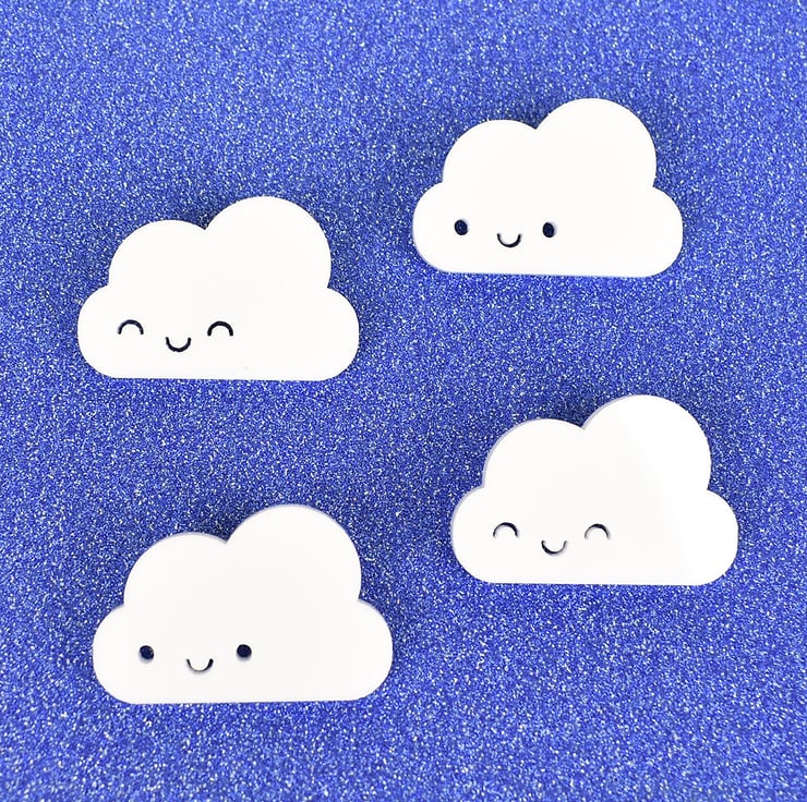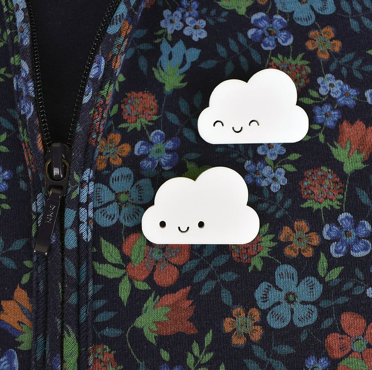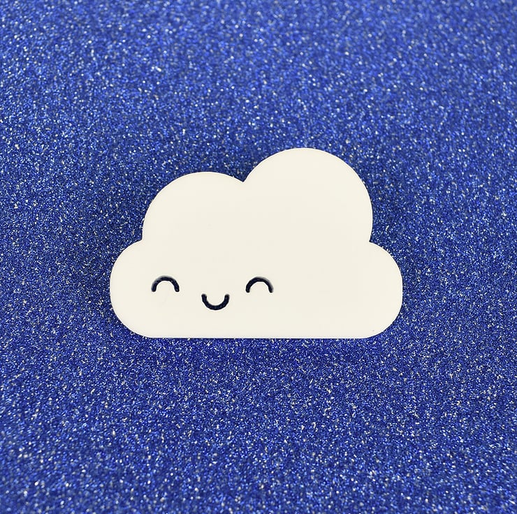 This simple sweet design is sure to make your day a little more cheerful! Each little fluffy cloud has been laser cut from white acrylic to my design. A brooch pin is attached securely on the back so he can come everywhere with you, on your coat or bag!