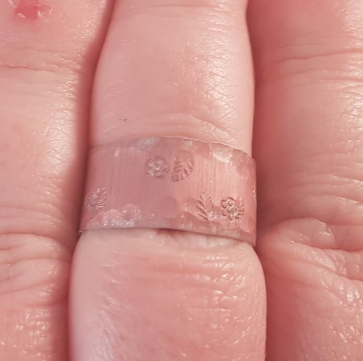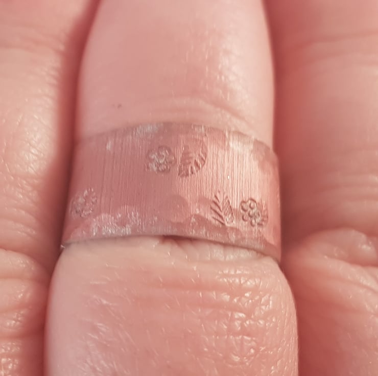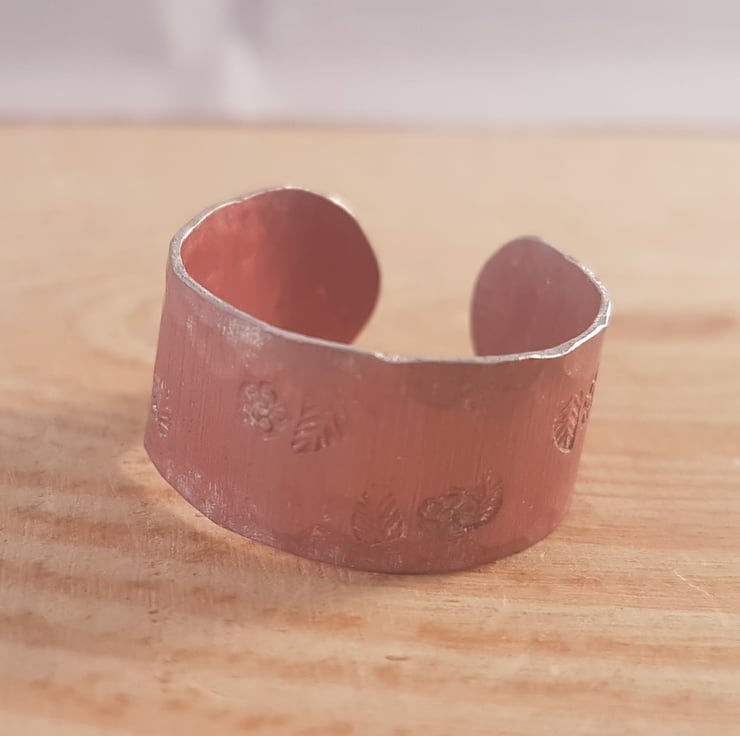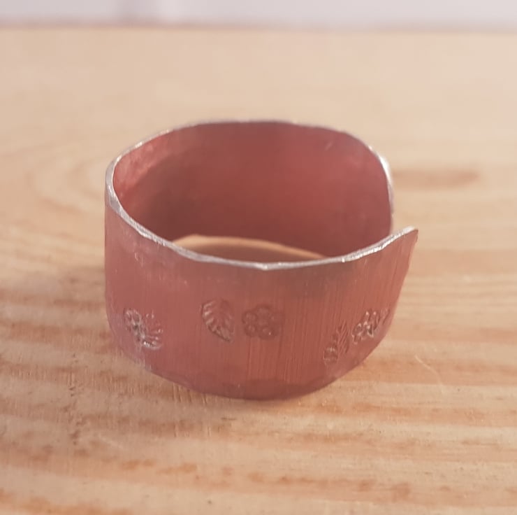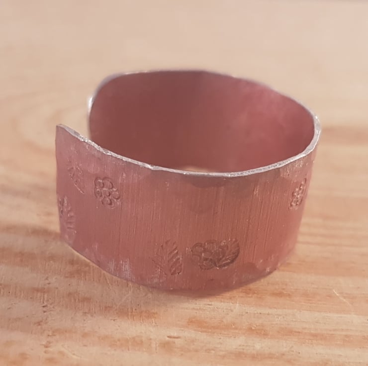 An understated and simple ring, hand made from a sheet of anodised aluminium. A strip of aluminium has been cut and dyed pink. The edges have then been hammered and stamped with small flowers and leaves.