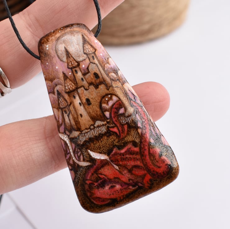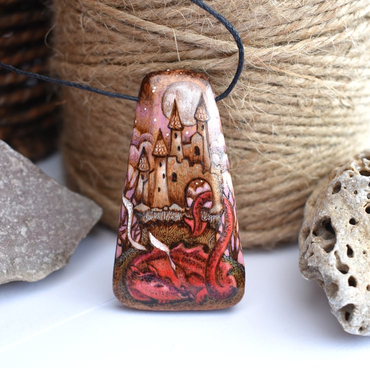 Pyrography fairytale sleeping dragon pendant, featuring a red snoozing beast and a cliff top castle. It has been decorated by hand using the art of pyrography, and highlighted using prismacolor pencil. Ideal for a lover of dragons, castles and fairy tales. It would make a great birthday or wood anniversary gift.