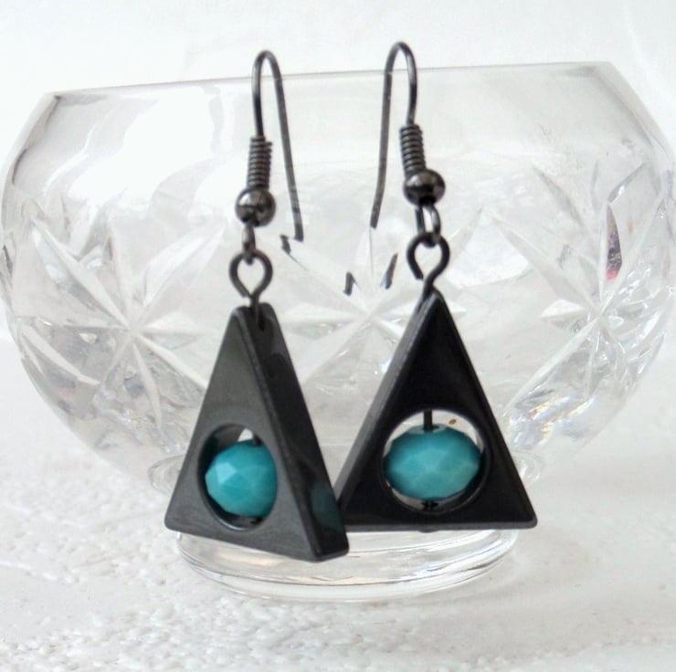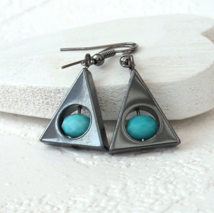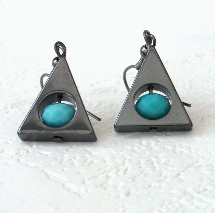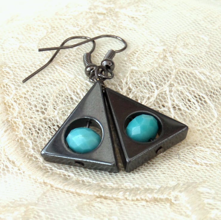 An unusual and eye catching pair of earrings, made using hematite triangles and lovely turquoise blue glass beads..