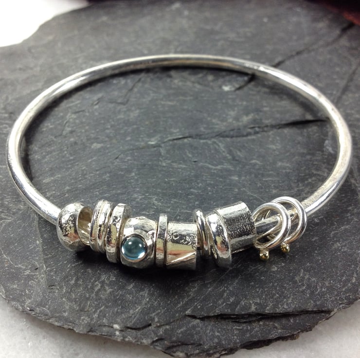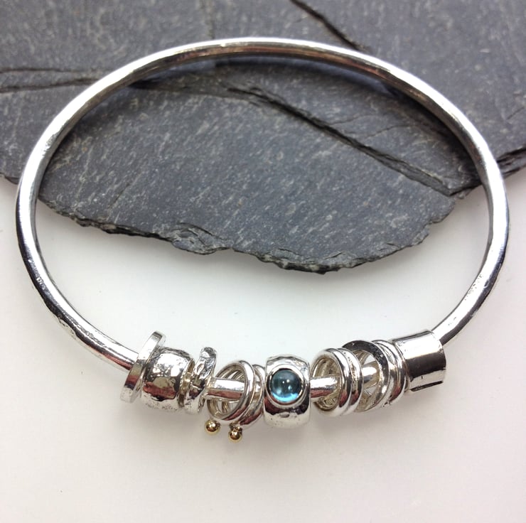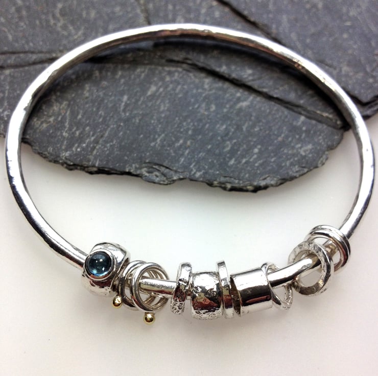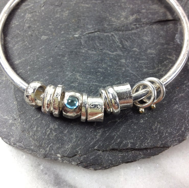 Ten different fused beads,a wide one set with 4 mm blue topaz, two with 18ct gold bobbles, 7 plain silver.