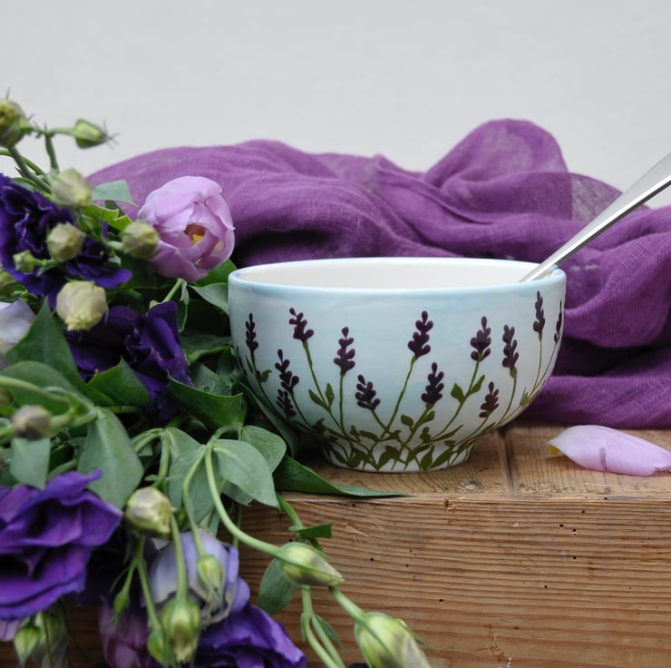 This cereal bowl is hand painted with lavender flower all around it with a pale blue background.
