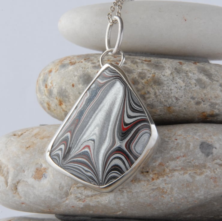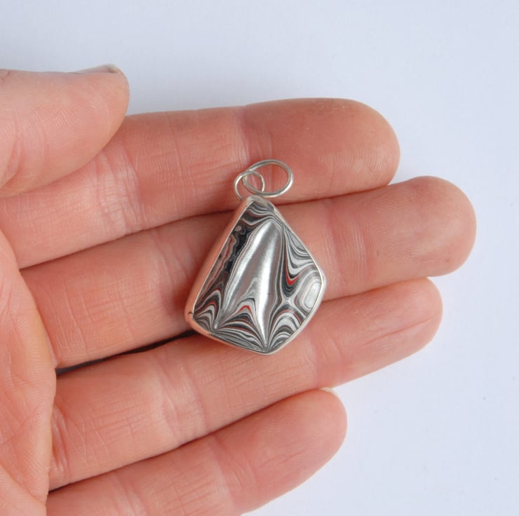 This sparkly pendant features a free form cabochon of fordite which is bezel set in sterling silver. The fordite has an eye catching arrow of sparkly silver across the middle surrounded with swirling patters in white, navy, red and black. The top is smooth with a glossy polish but has undulations in it - these are due to the shape of the rough material that I cut it from and give it character.
