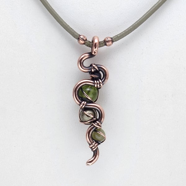 Snaking copper wire woven with subtle, soft green aventurine, peridot and pyrite beads make this understated pendant a perfect addition to your spring and summer jewellery collection. A robust everyday wear necklace with muted grey-green leather cord.