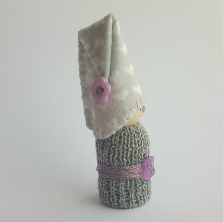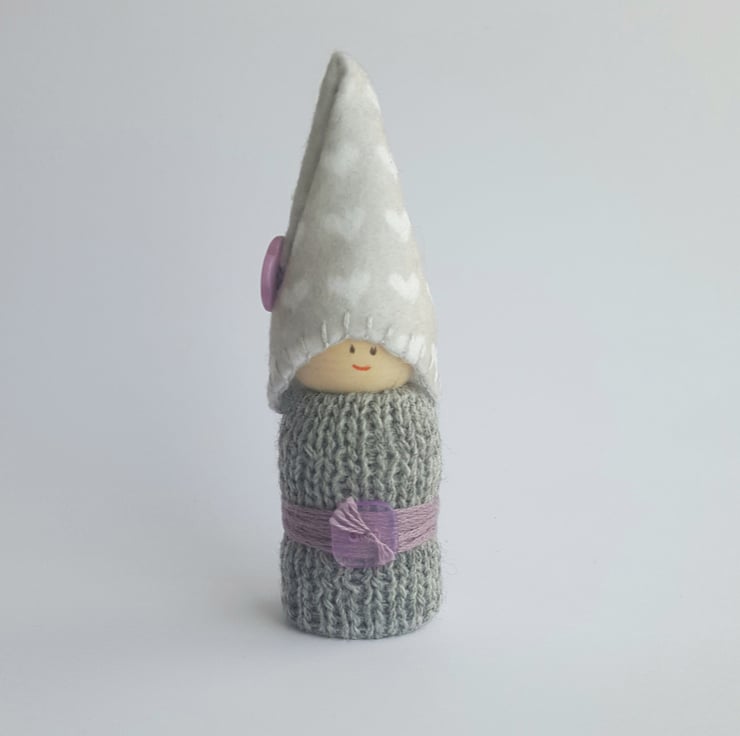 This sweet little gnome is wearing a hand stitched felt hat from soft grey and white heart print felt and finished with a lilac flower button.