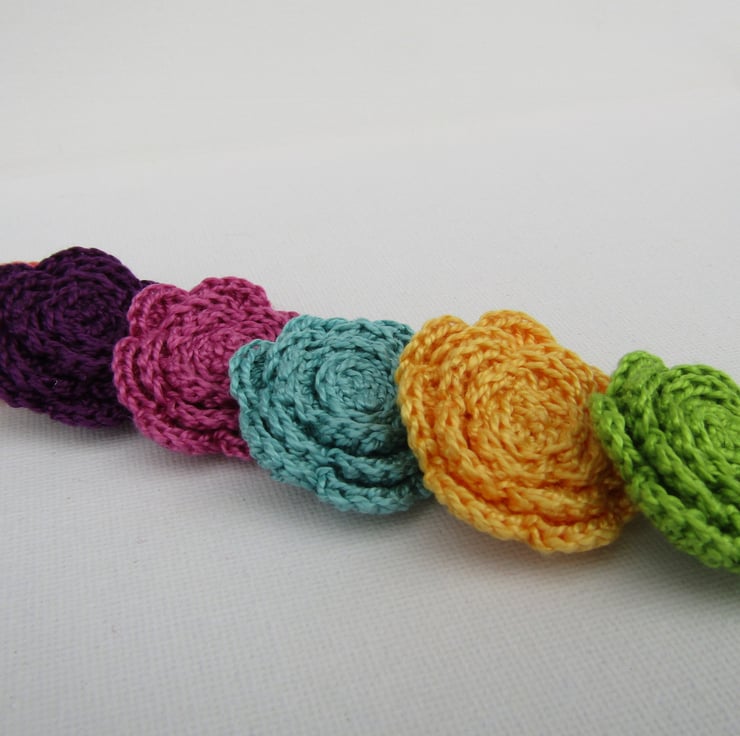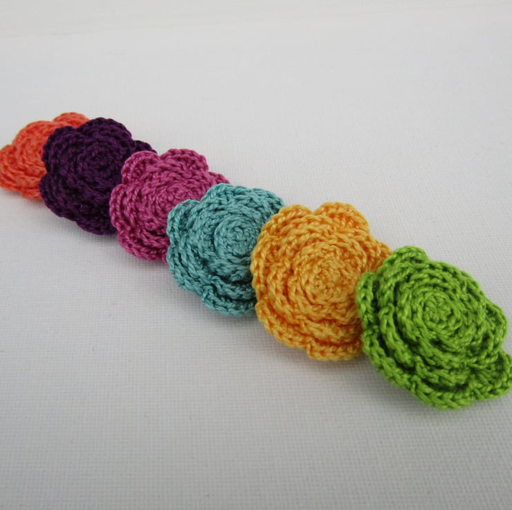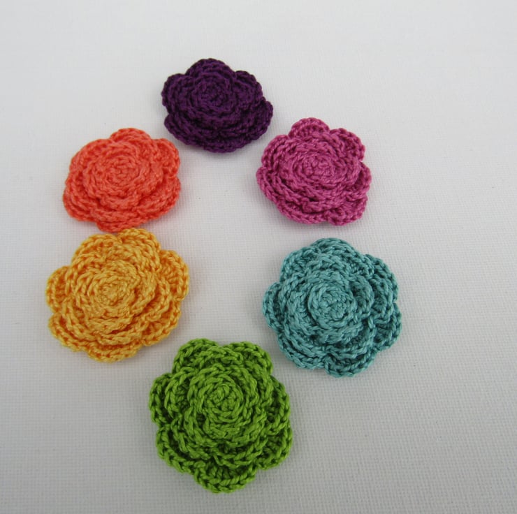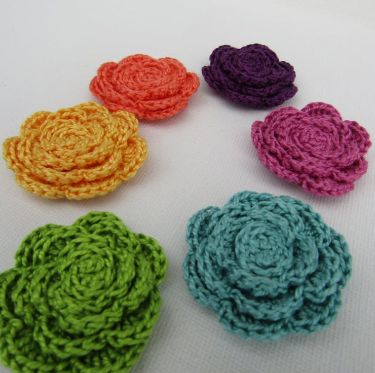 Beautiful crochet flowers perfect for sewing onto blankets, clothing, card making or scrapbooking.