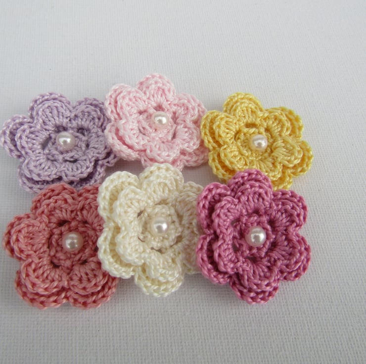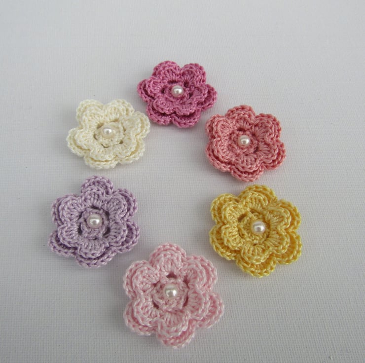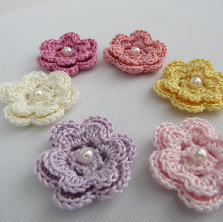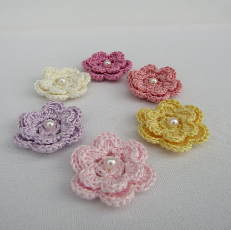 This listing is for crochet flowers with pearl centre. Each flower is made from 100% crochet cotton and measure 4cm.
