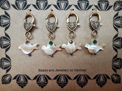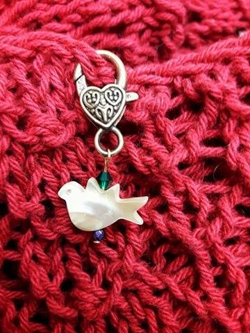 Handmade Stitch markers for crochet, made with pretty Mother of Pearl Dove charms, with Czech Precoisa Crystals in Purple Ab and Emerald.