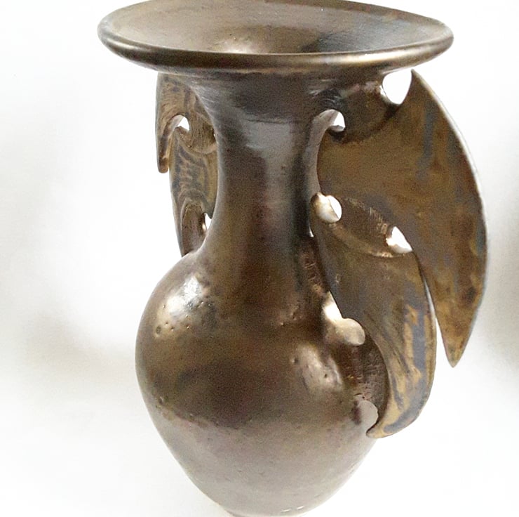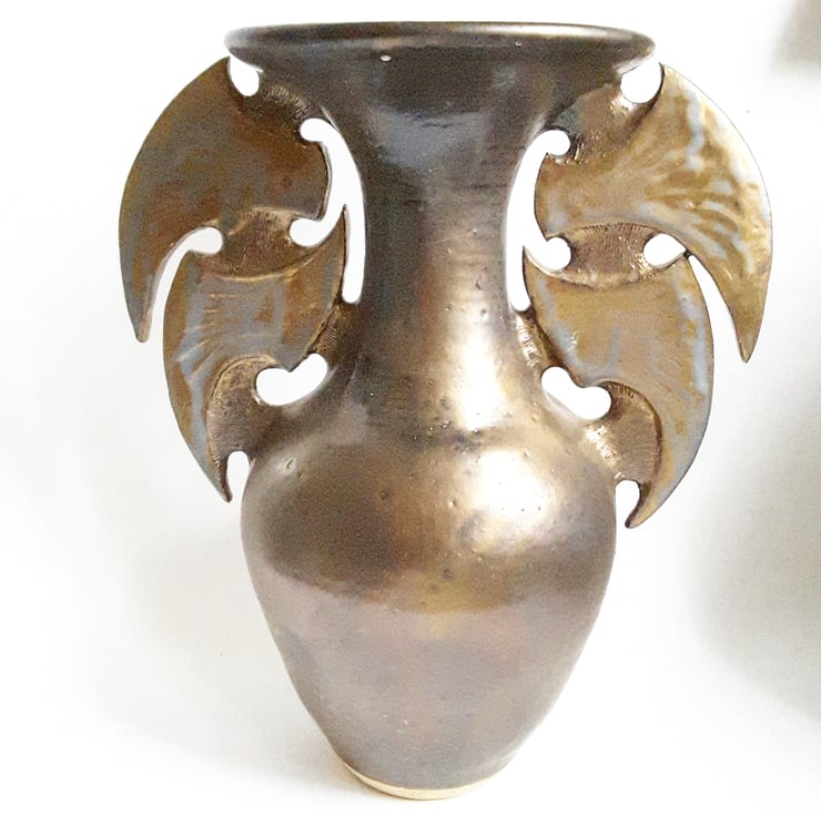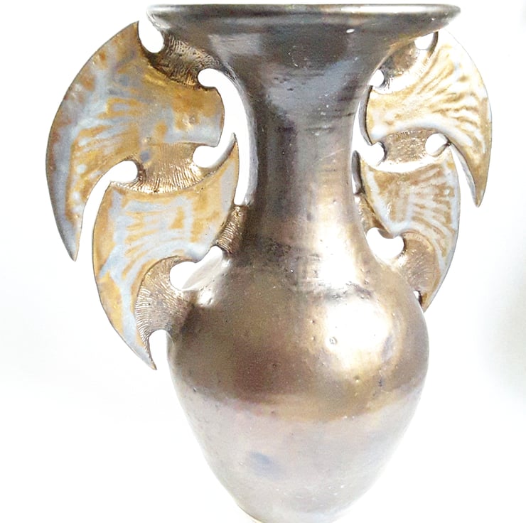 This is a handmade wheel thrown Ceramic Vase with added wing like structures on the neck of the vase.