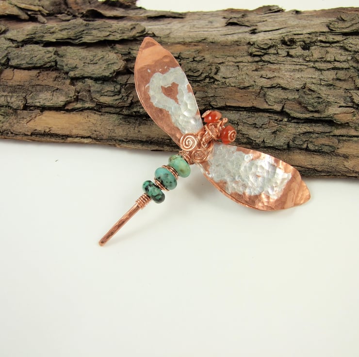 Handmade Dragonfly Brooch with turquoise and carnelian gemstones