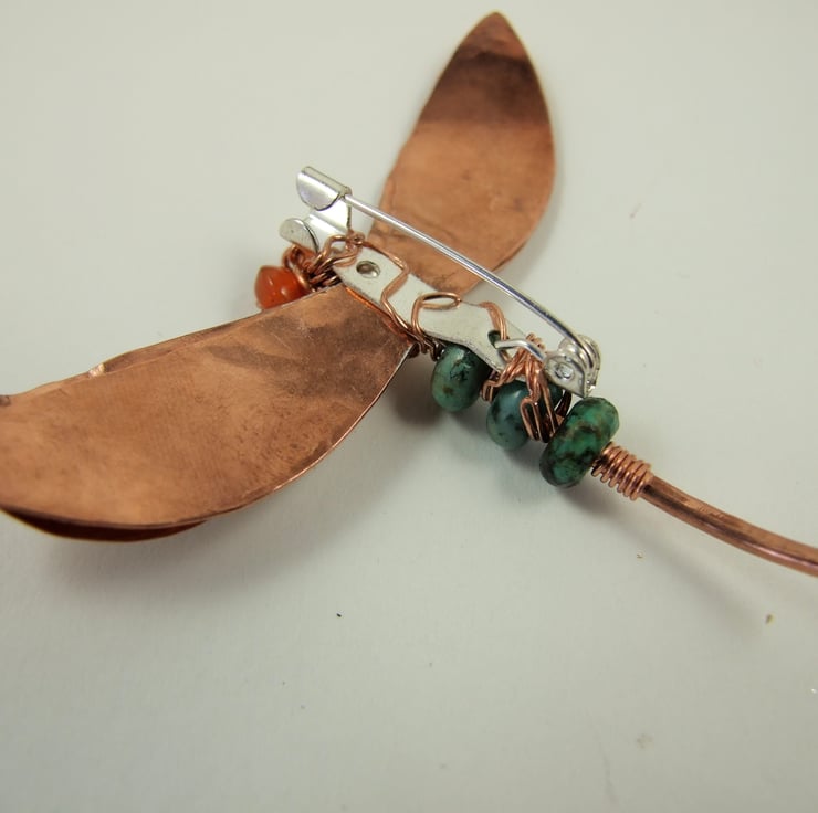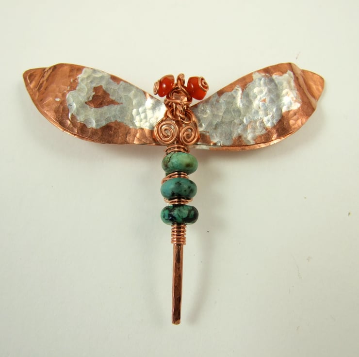 I have cut the wing shapes from copper sheet then sanded and hammered to create the textured and patterned effect. I have added a flow of silver for decoration and soldered the wings to a copper wire 'body'. To thsi I have added sone turquoise gematone beads fr the body and wire wrapped some carnelian beads for the eys, decorated with wire wrapping and scrolls. Fitted to a silver tone pin fitting.