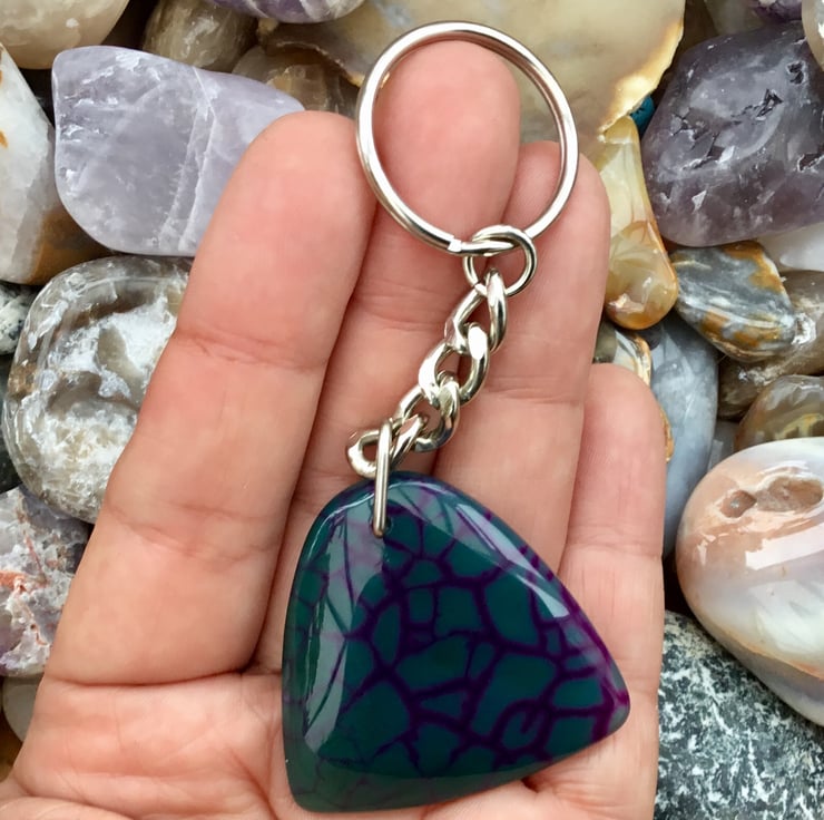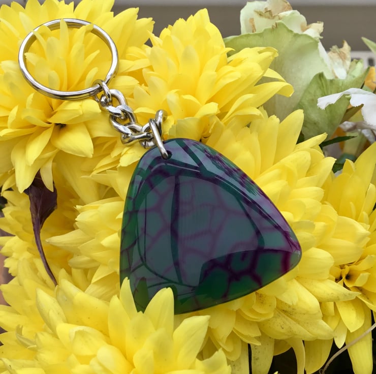 A Beautiful green and purple veined rounded triangular translucent Agate Gemstone Keyring, with silver tone keychain & split ring, to make this item useable as a keyring, or handbag charm.