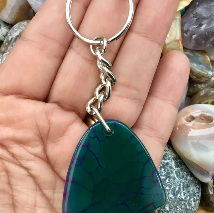 The Gemstone is roughly triangular and slightly domed to the front and flat on the back and rounded along all the edges and corners, highly polished all over and has been simply drilled in the centre of one of the points to support a silver tone triangle bail, from which the curb style keychain & 2.5cm diameter split ring have been attached.