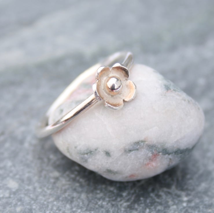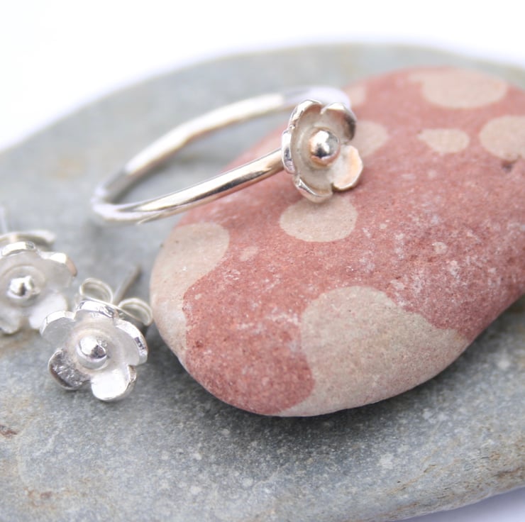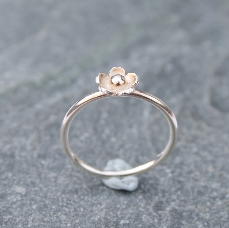 This ring is hand made from sterling silver and created to order to your size requirements. The flower has five petals and is gently domed with a silver ball in the centre, the diameter of the flower measures 8 mm. Each flower is cut by hand and therefore there may be slight variations from the one in the images.