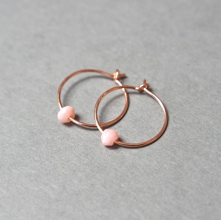 A small pair of 14k rose-gold filled hoops with beautiful faceted Peruvian pink opal beads.
