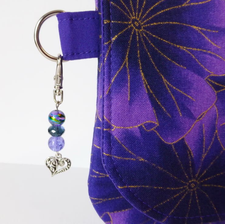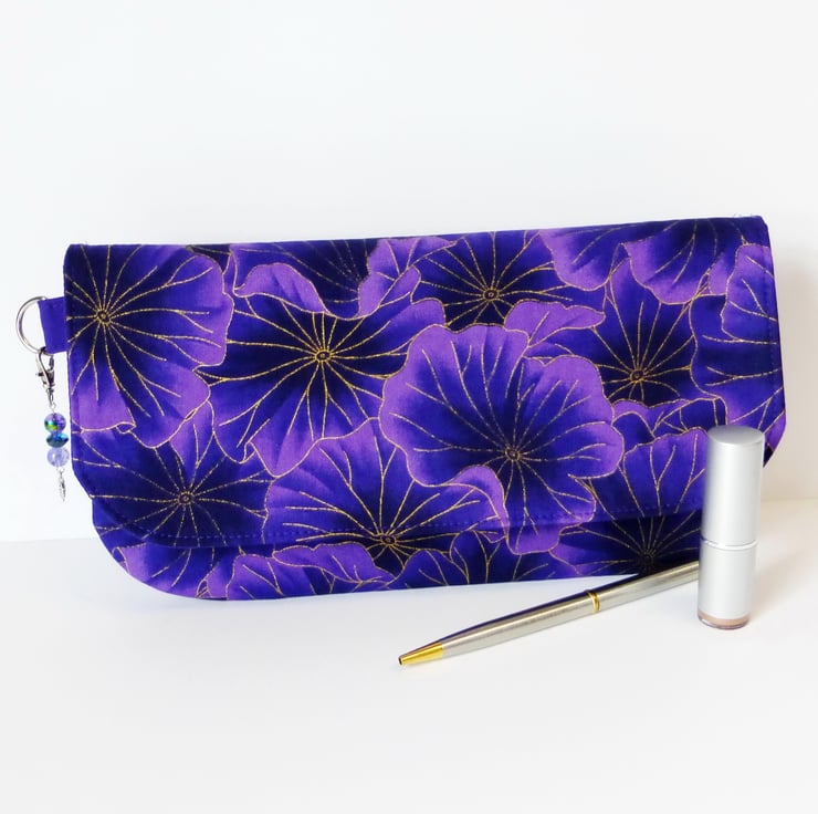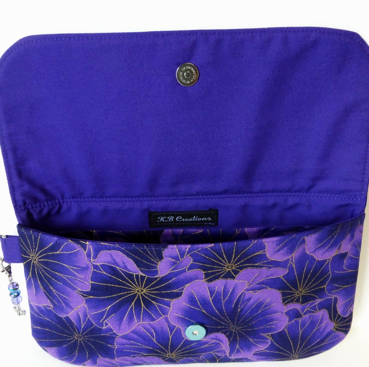 This is a lovely clutch bag made in a purple floral cotton print fabric, with metallic gold coloured highlights.