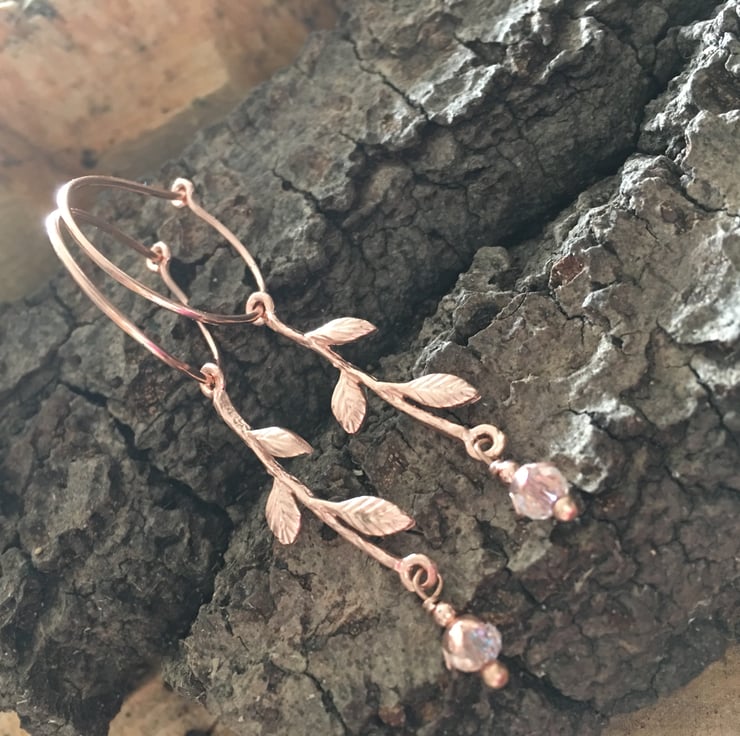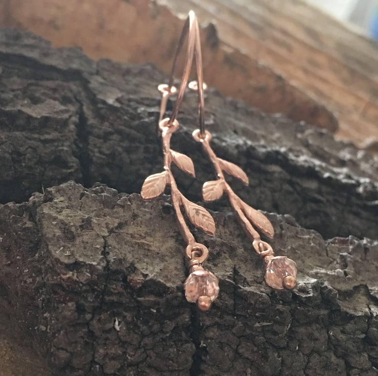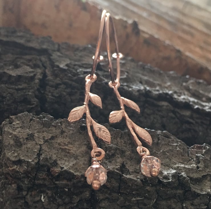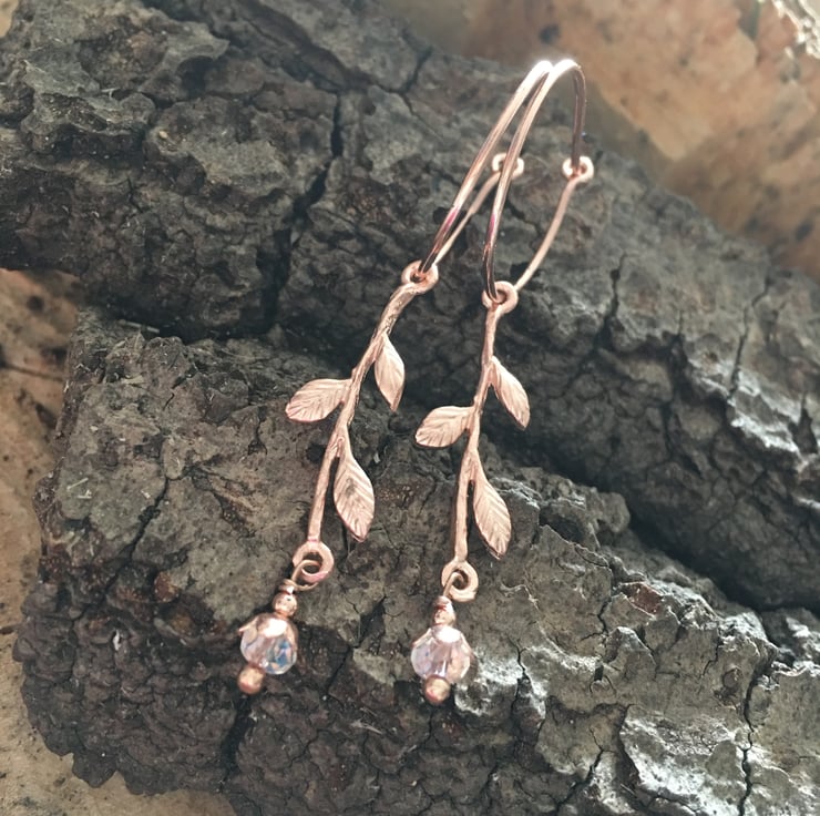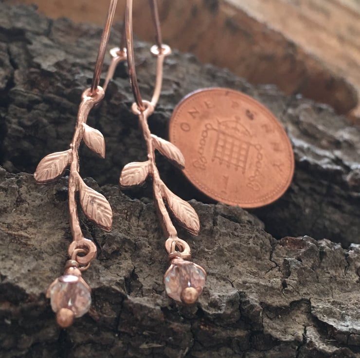Long drop earrings flower & twig design, rose gold plated silver and crystal flower jewellery. Rose gold, gives the flowers warmth, whilst the silver is gentle on even the most sensitive skin.