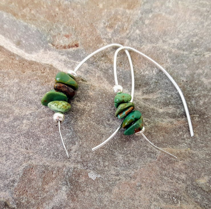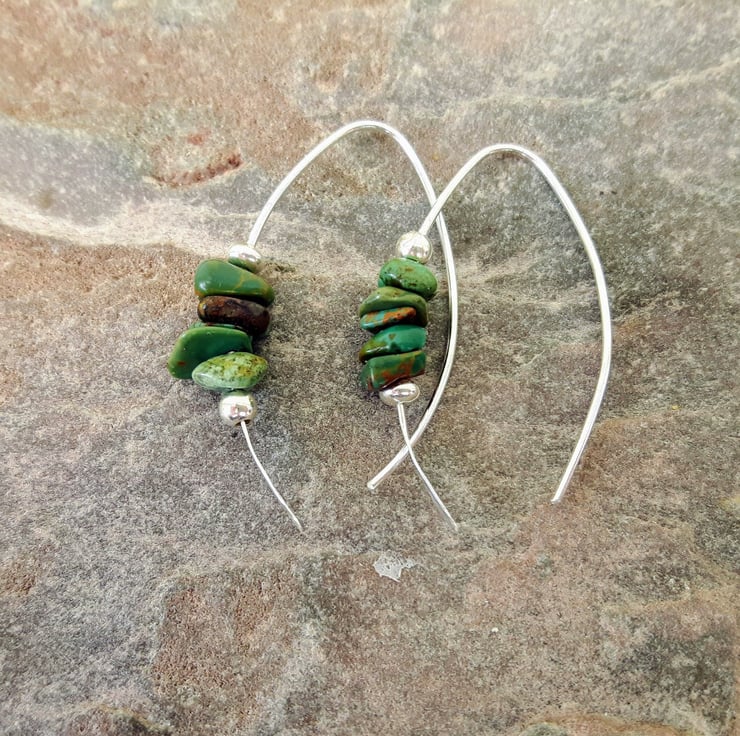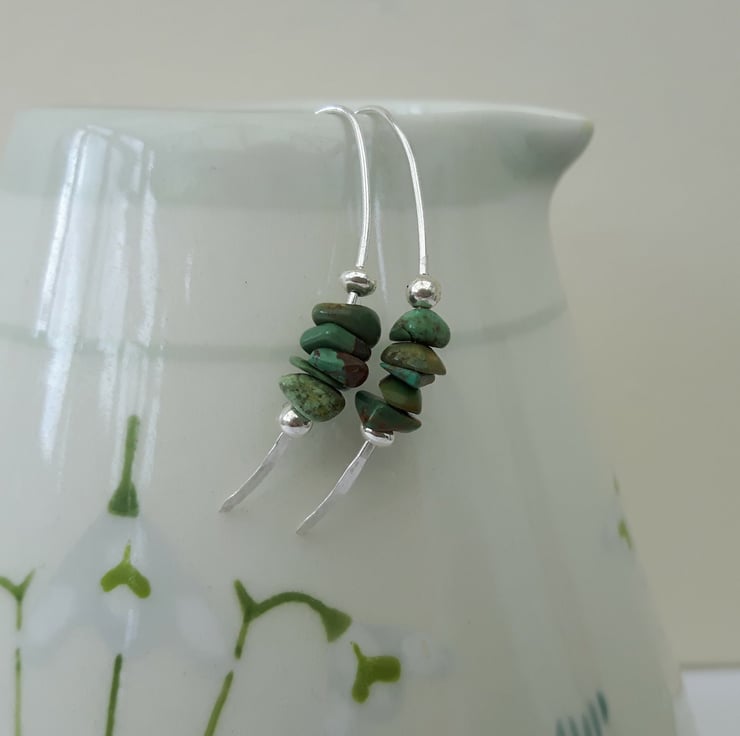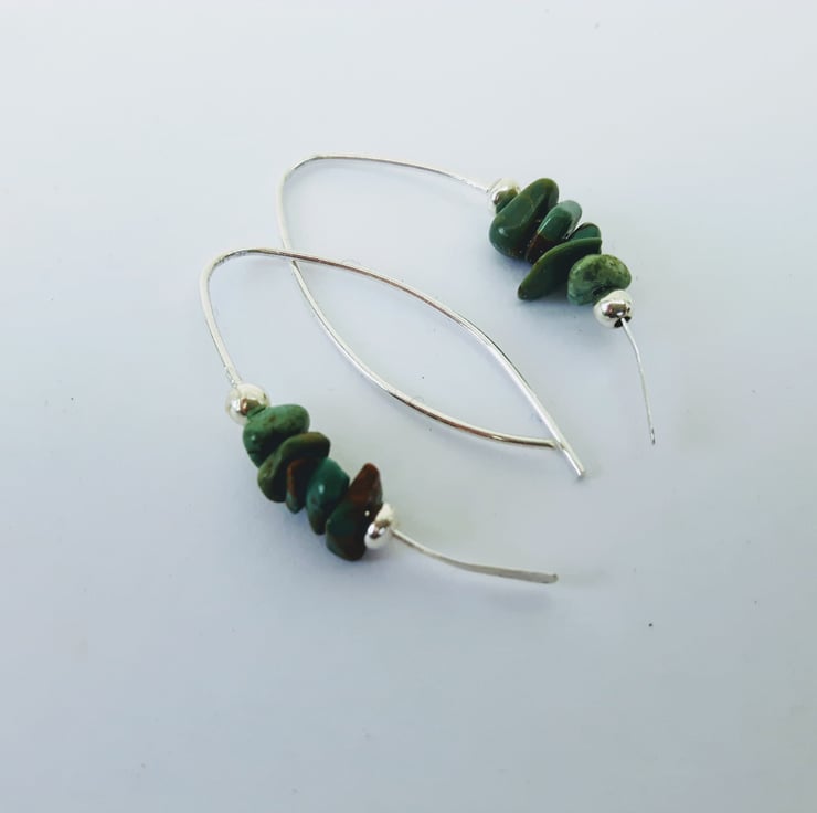 These stylish earrings feature a neat one piece design made from sterling silver wire which has been partly rolled to flatten one end and then hammer textured so that it is wide enough to support the beads. I have used natural turquoise gemstone nuggets with sterling silver round beads above and below them. The hooks are long enough to pass through the ear and stay in place without fiddly butterfly scrolls to hold them. These earrings will be packaged in a smart gift box and sent to you by Royal Mail first class post.
