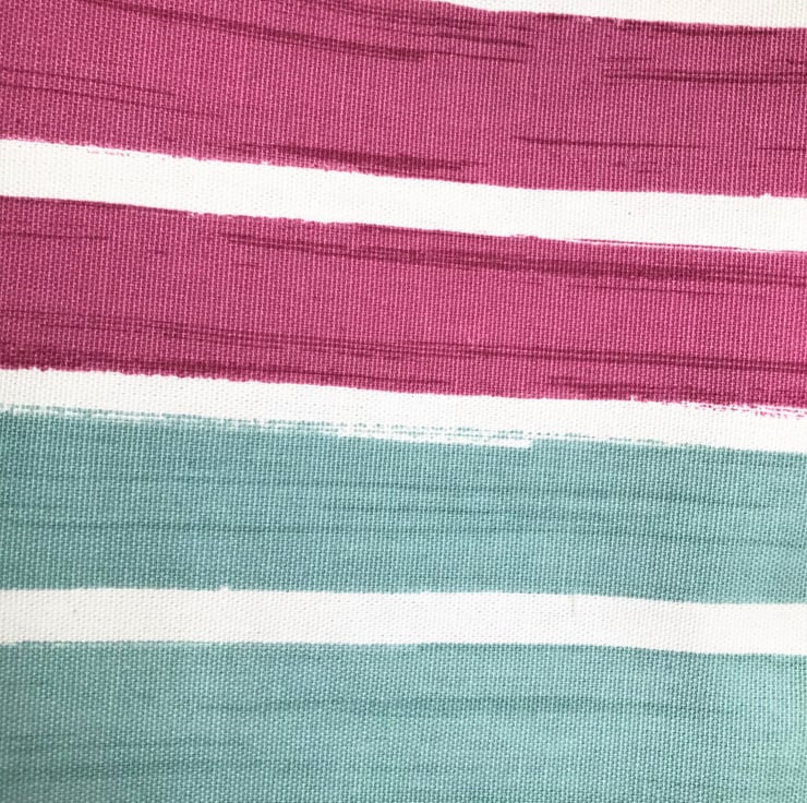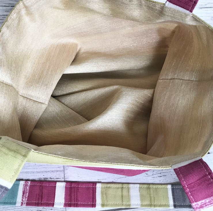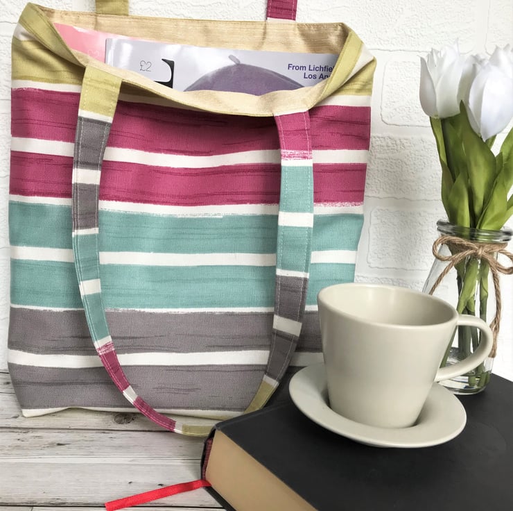 A useful tote bag in in a striking print fabric with bright stripes on a white background. The stripes are in lovely summery shades of yellow-green, cerise, turquoise and grey. The bag is lined with creamy beige fabric with a slight sheen.