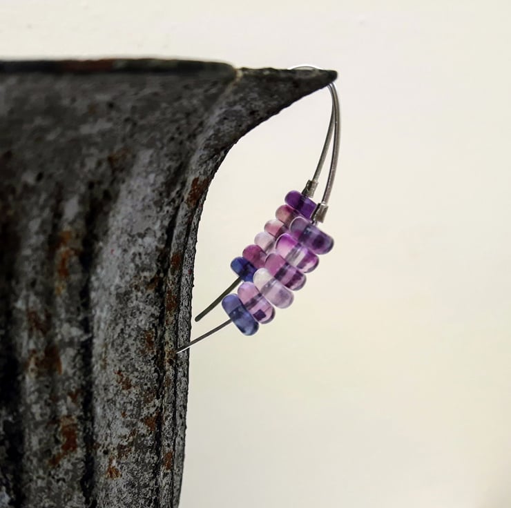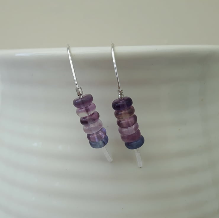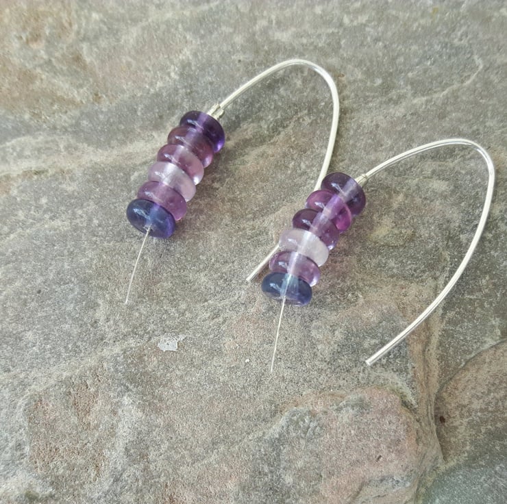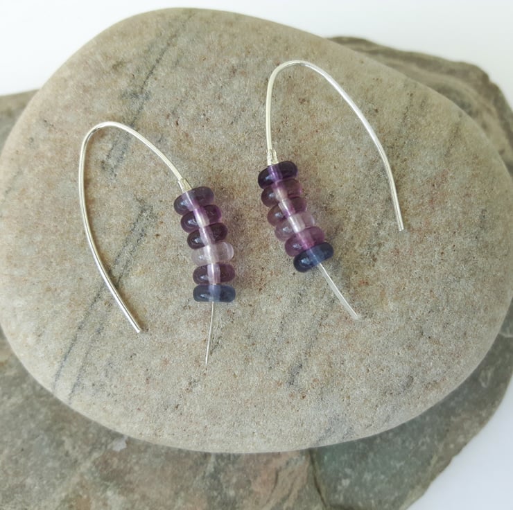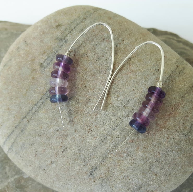 These sterling silver drop earrings in a minimalist single-piece design feature rondelle beads of rainbow Fluorite in pretty shades of lavender, pink and blue. The long curved hooks enable them to stay in place without butterfly scrolls. I have used a rolling mill to flatten the hooks at one end so that the beads cannot fall off.