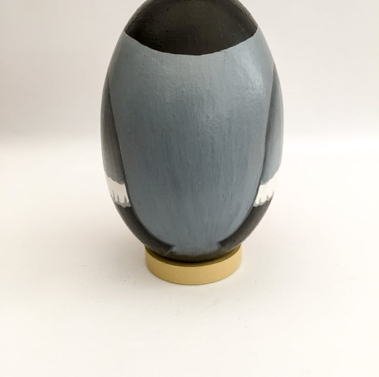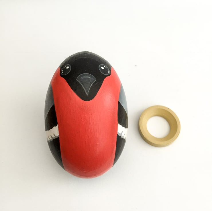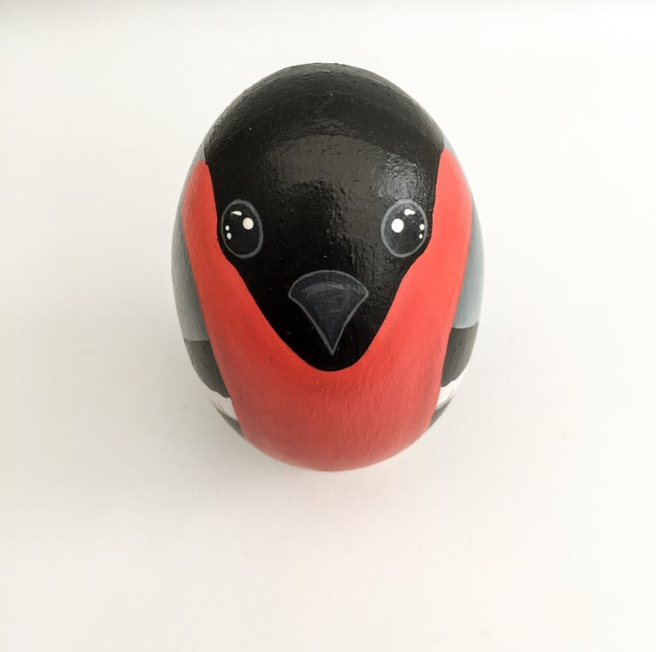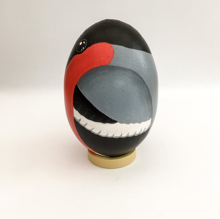 This is a bullfinch that has been hand painted on to a solid beech wood egg .