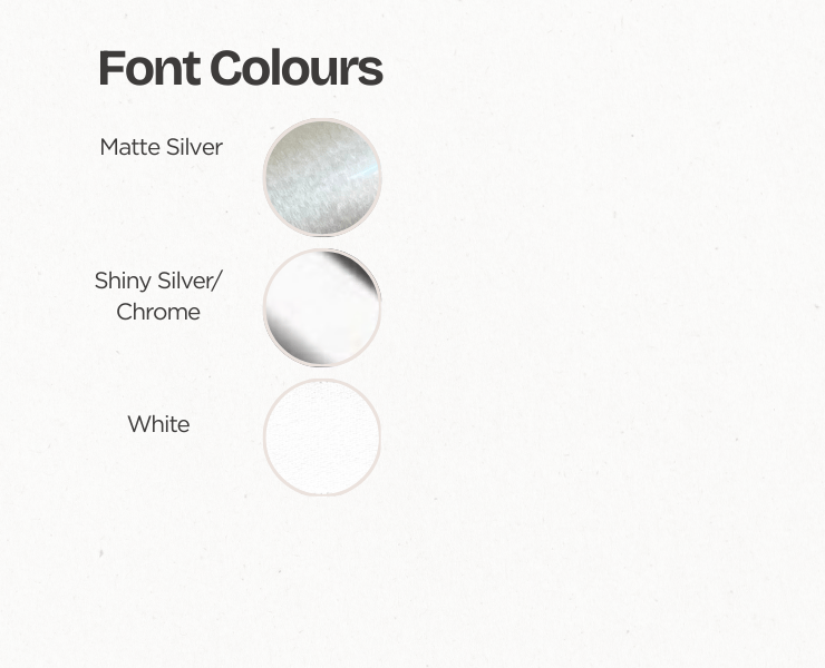 Your personalisation will be placed on the ribbon tails. Simply choose your preferred font and colour (see listing photos). If no choice is noted, we’ll use Matte Silver with Font 1 as standard. (Please note: Font 2 is uppercase only.)