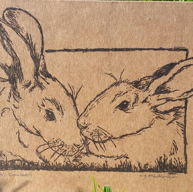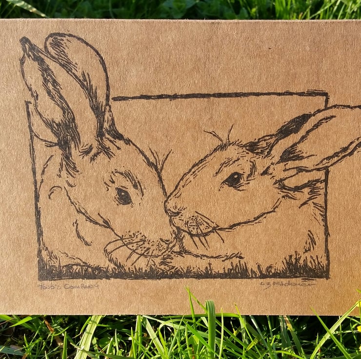 I had a large rabbit called Smutt as a child,he was a wild spirit who spent the day loose in a field with our horses, in the afternoon he would wander into the house demanding our attention then, in the evening, would wait by his hutch in the garden to be put to bed. They are sociable creatures and that is what this card is meant to portray. These rabbits are based on 2 that were rehomed by the Margaret Green Animal Rescue at their home in Church Knowle, Dorset. So, if you live nearby please pop in if you are passing, you may find a couple of real rabbits to love