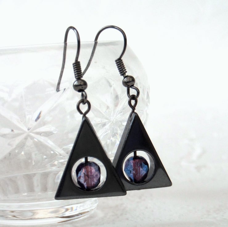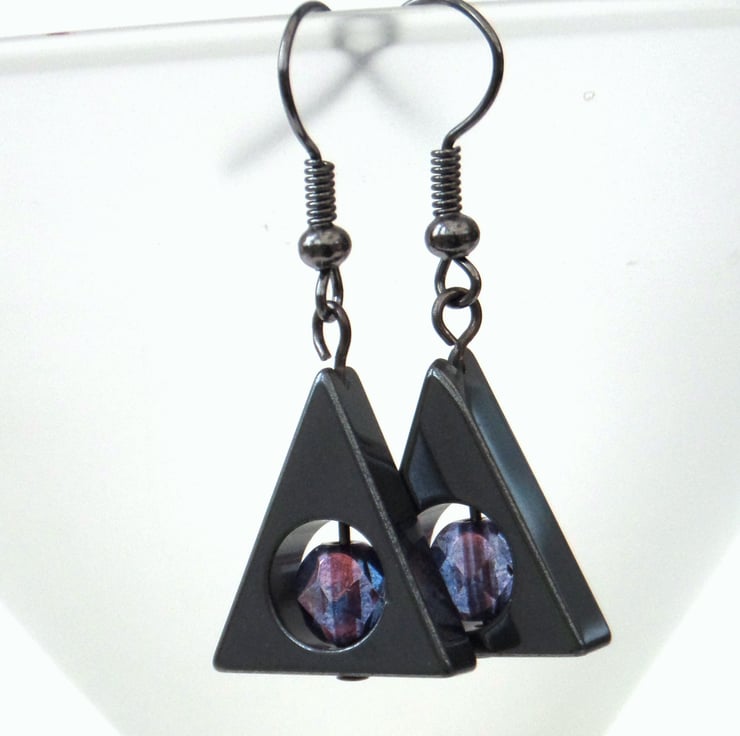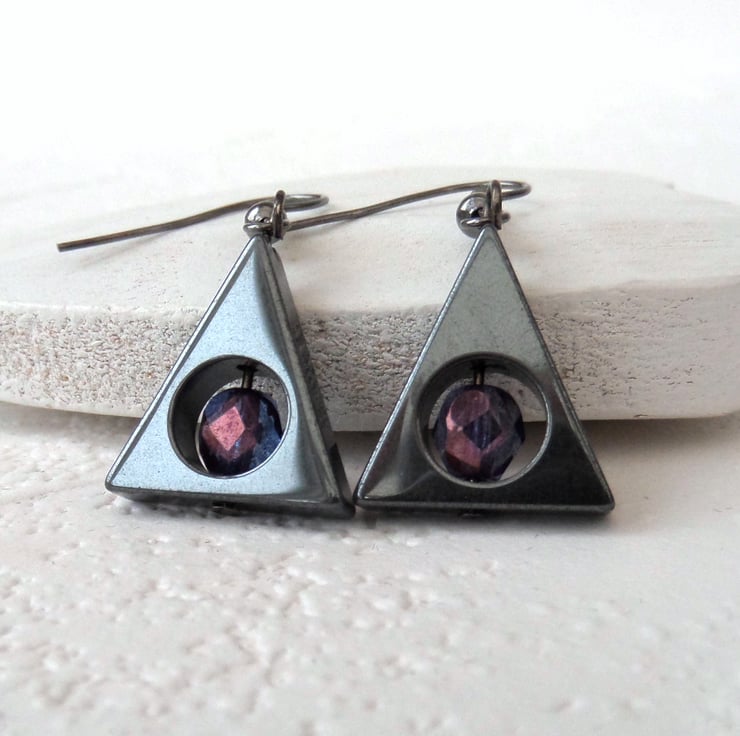 An unusual and eye catching pair of earrings, made using hematite triangles and amethyst crystals.