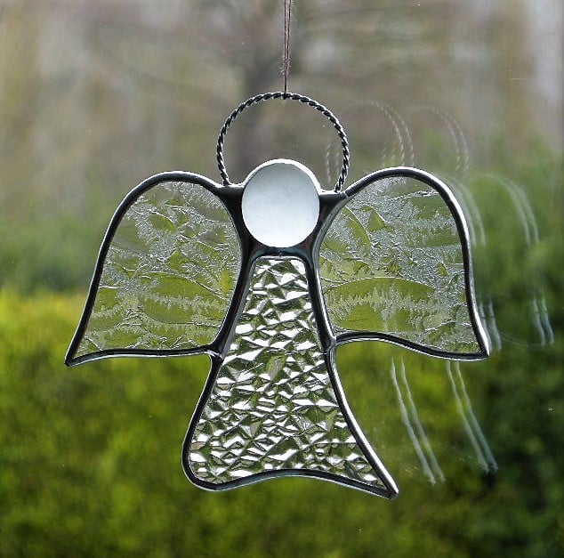Beautiful stained glass abstract designed hanging window suncatcher (Angel) has been handcrafted and designed by myself using the traditional copper foiling method. The design is effective with the glass colours, with this "Angel" is two different clear textures of glass for the body and wings. A glass glob (frosted white) forms the head of the Angel.