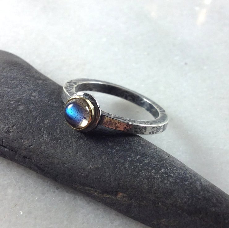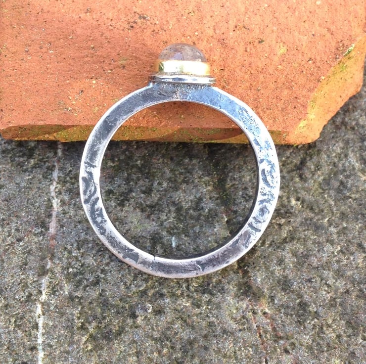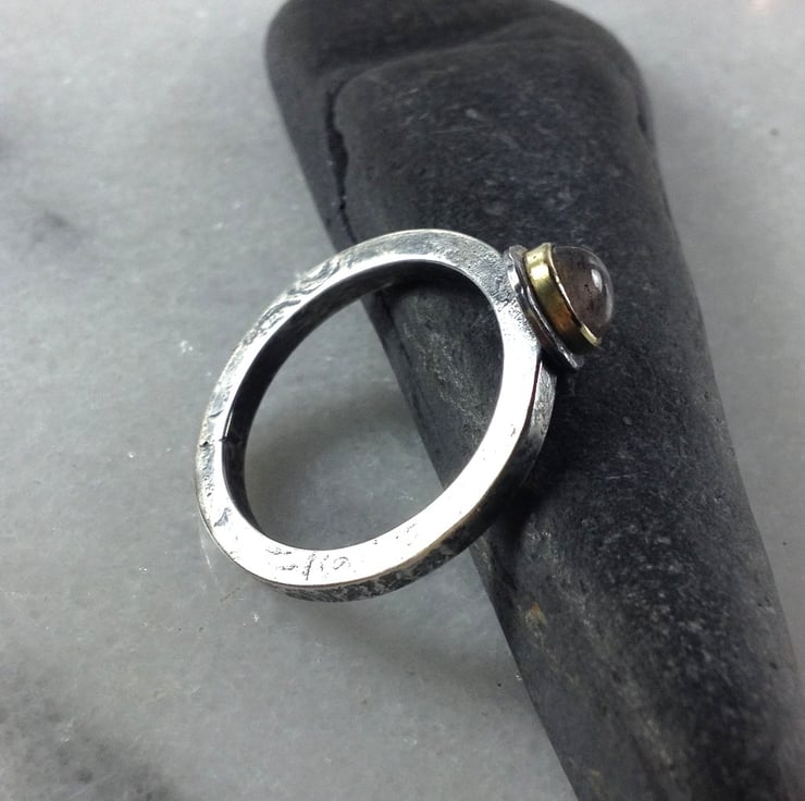 This is a chunky rustic mixed metal ring , set with a 5mm cabochon. The silver has been hammered for texture and pattern, oxidised ,then burnished and buffed to a subtle shine.
