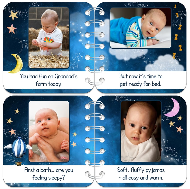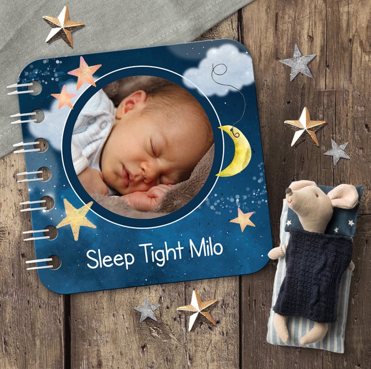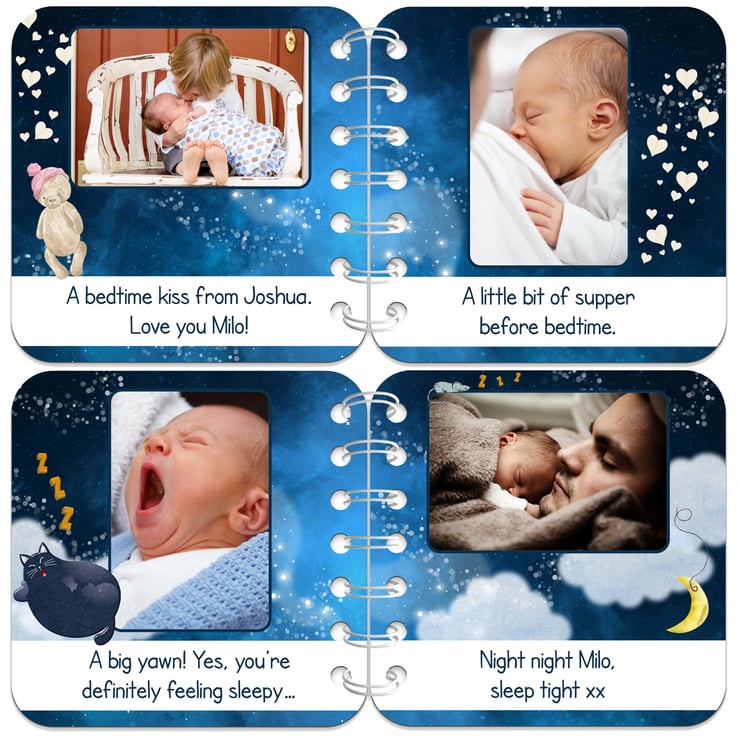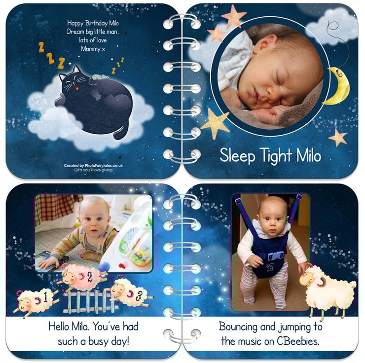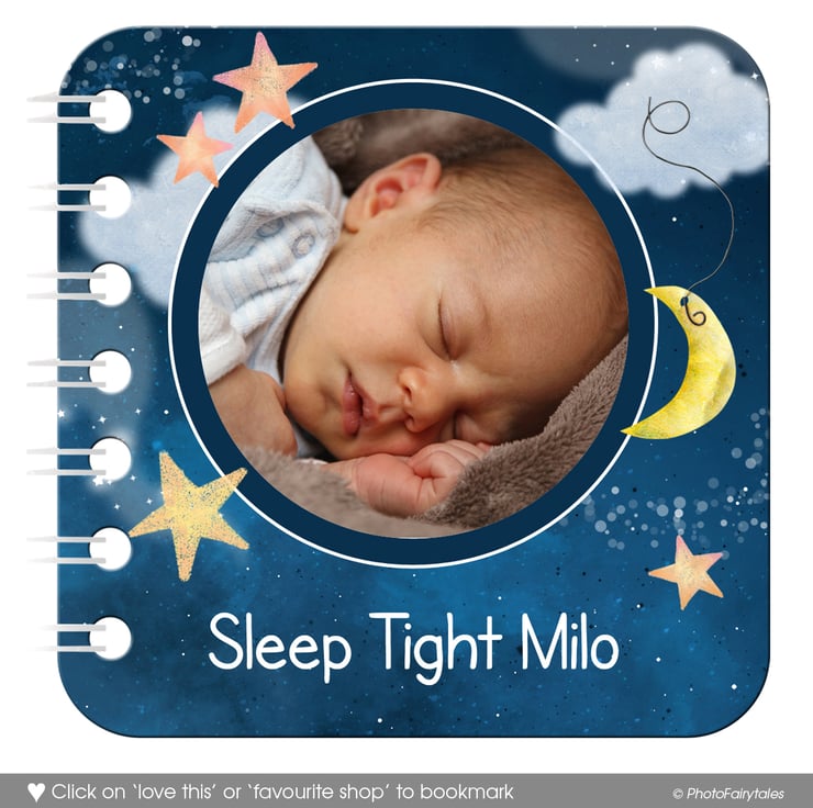 Snuggle up with your baby or toddler and enjoy reading them their very own story book, handmade especially for them and featuring your own photos and wording. ‘Sweet Dreams’ is one of a range of personalised board book designs I create and is ideal for bedtime: featuring soft dark blue colours, twinkling stars and sleepy sheep. View my shop to see more designs!