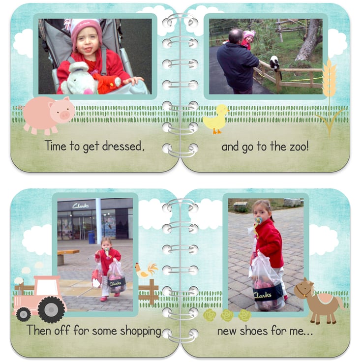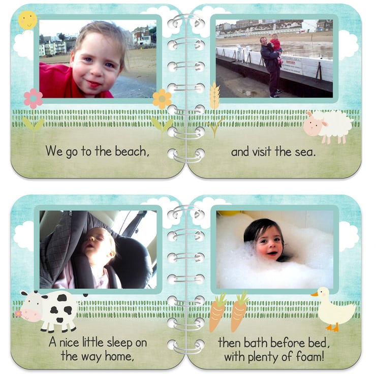 The book has 12 pages, is made from acid-free board and measures 10x10cm. The outside back cover has space for your own message up to 4 lines. The cover and inside pages feature your chosen photos and text (max 60 characters), creating a book that’s totally unique to your child. The corners are trimmed by hand into smooth rounded edges. The book has a glossy hard wearing laminated finish which really brings your photos to life. It can be wiped clean with a slightly damp cloth.