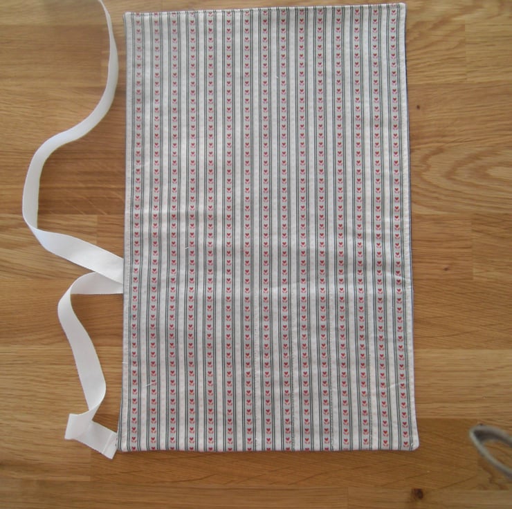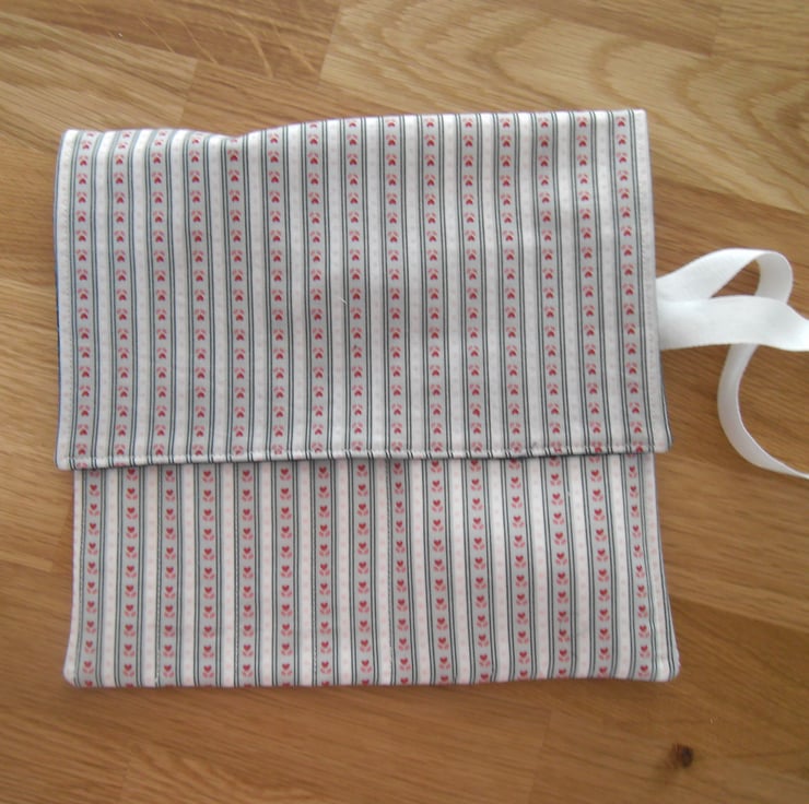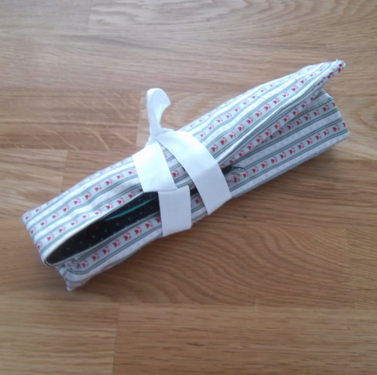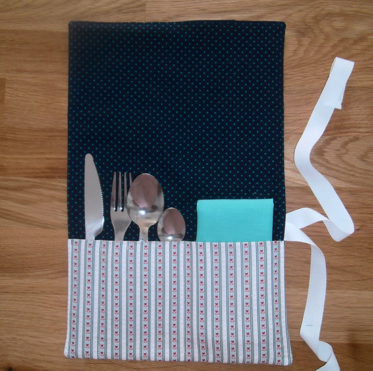The outer is made from a red and grey heart printed fabric and is lined with navy fabric printed with green dots..There are four slim pockets to hold your cutlery, and one larger to hold a napkin. Interlined with a layer of fleecy fabric. White cotton tape to secure.