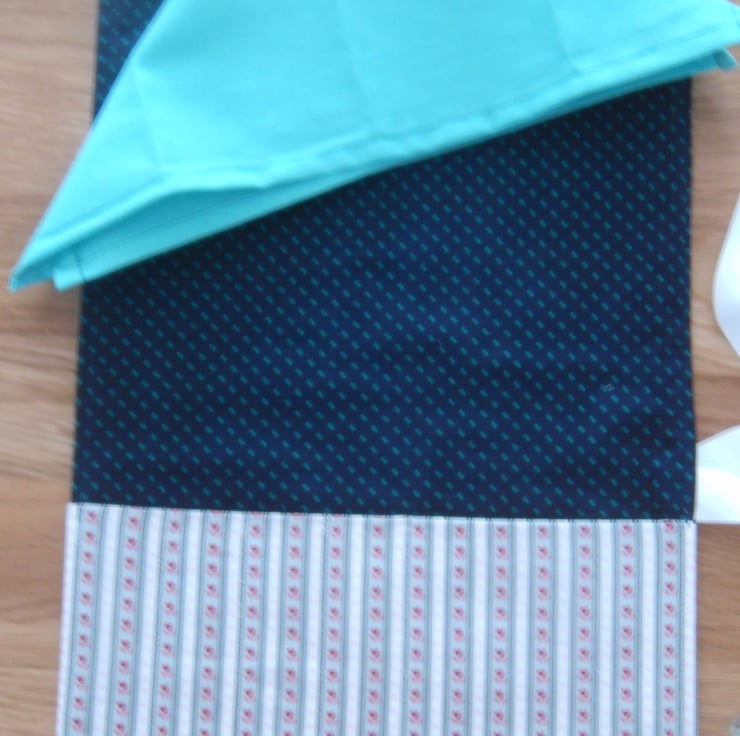 All fabrics were laundered prior to making, and the roll can be gently hand washed, dried naturally and ironed on a cool setting. Napkin may be machine washed.