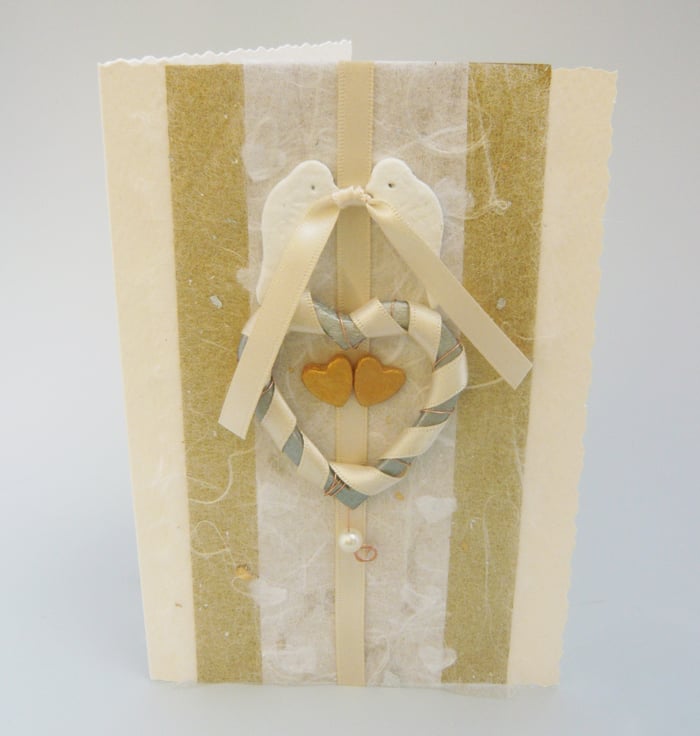 My motifs are made from salt dough using a traditional recipe. Each motif is carefully varnished to enhance and protect it. I use lots of handmade papers to add texture. Copper wire, beads and ribbons are used as embellishments. Each card is unique. The card card is A6 105 x 148mm and made from recycled deckle edged card. The card is left blank inside for you to add your own message. Each card comes with a brown kraft envelope. Your card with be sent by first class post in a clear bio degradable bag in bubble wrap, in a cardboard box that can be reused to send your card.