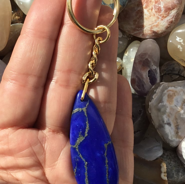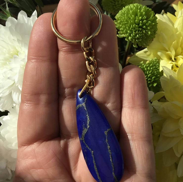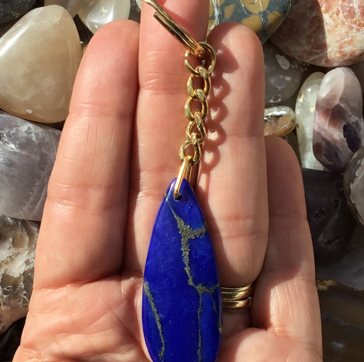 Midnight Gold Droplet. A Beautiful rounded tear drop shaped Stabalised Lapis Lazuli Gemstone Keyring, with gold tone keychain & split ring, to make this item useable as a keyring, or handbag charm, an ideal gift for a lady or a gent.
