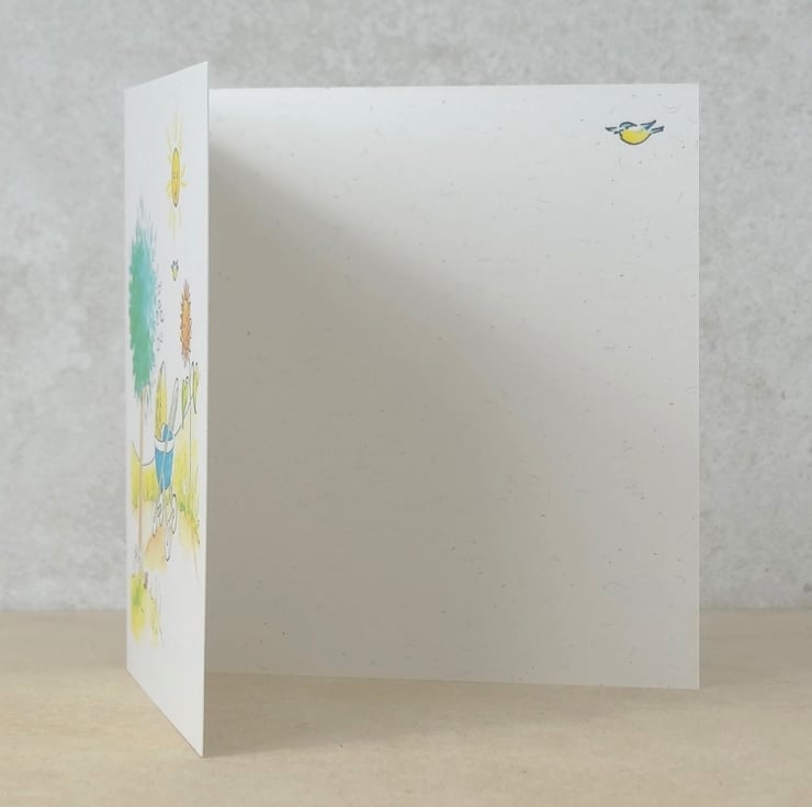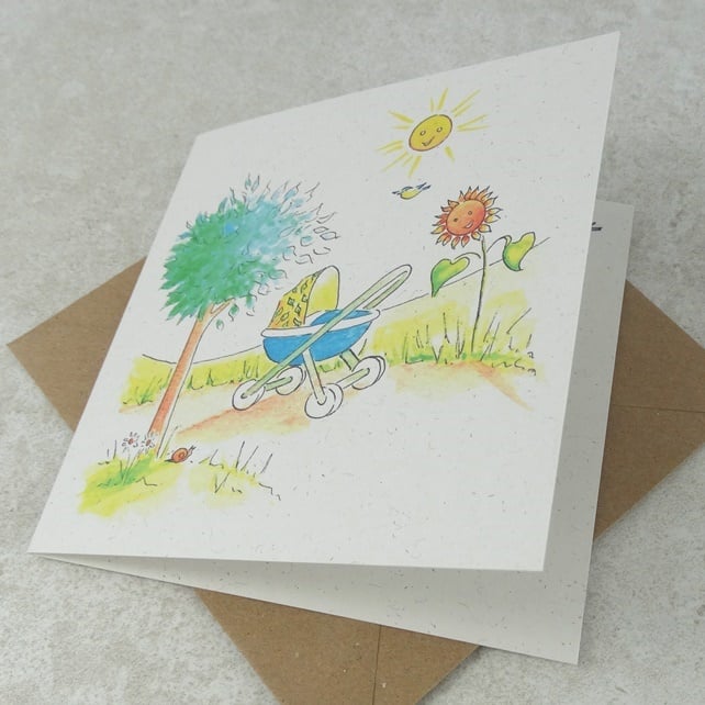 This eco friendly new baby card has been printed using 100% recycled oatmeal finish style 320g card, using my original illustration and has been left blank inside for your own special message. This card has lovely naturally occurring flecks as shown in photographs above.