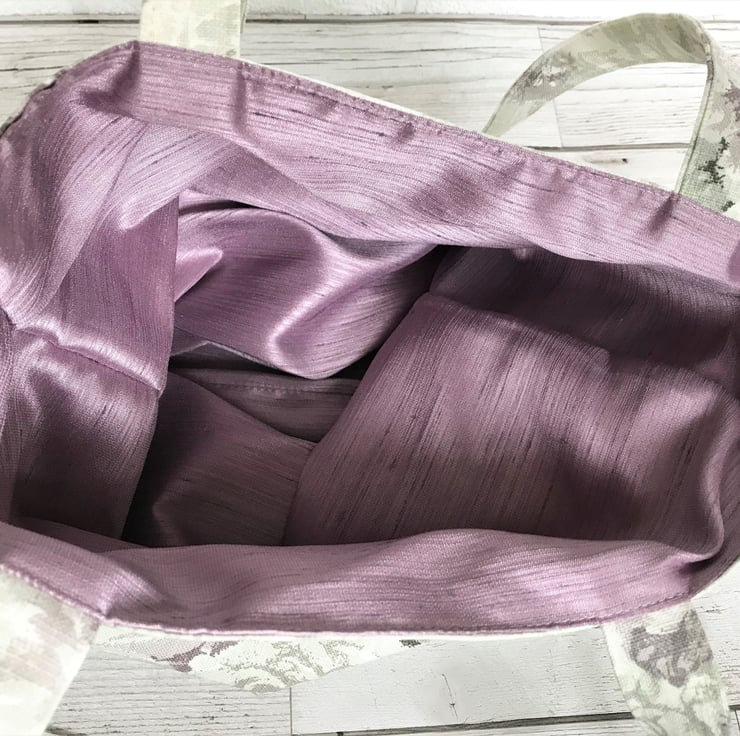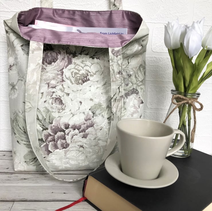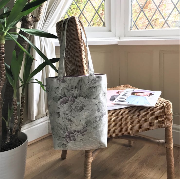 A pretty tote bag in pastel print fabric with a beautiful pattern of large Roses. The pattern incorporates subtle shades of pale grey, green, lilac and cream. The bag is lined with a lovely lilac satin-finish fabric.