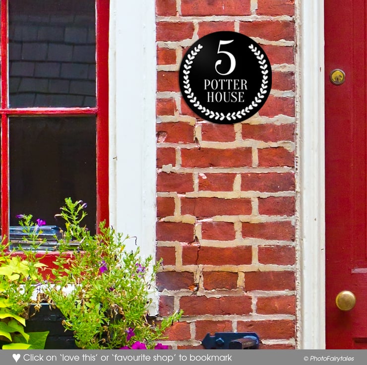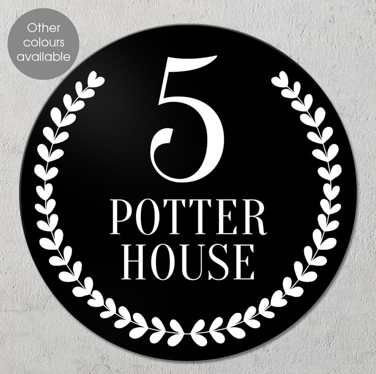 This round personalised house sign is available in a choice of colours and is made from hard wearing acrylic, so it can be safely displayed outdoors in all weather. The ‘Laurel’ design features a simple wreath of leaves in a classic style that will add a tasteful and elegant finishing touch to your front door.