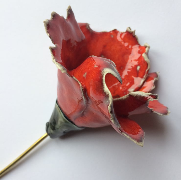 The rich poppy red glaze gives each flower a timeless quality which will never fade or age, the handmade petals are made from a quality white clay and finished to a delicate fine edge. Each flower is stamped with my designers mark.