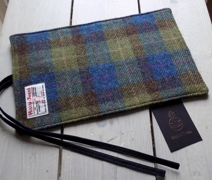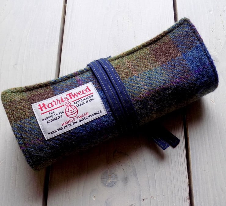 Harris Tweed pencils roll/wrap: tartan weave in blue, olive green and dark brown, with violet and tan overcheck.. Suitable for pens, pencils, makeup brushes or craft items such as crochet hooks. Pencils and other accessories shown in the photos are included: