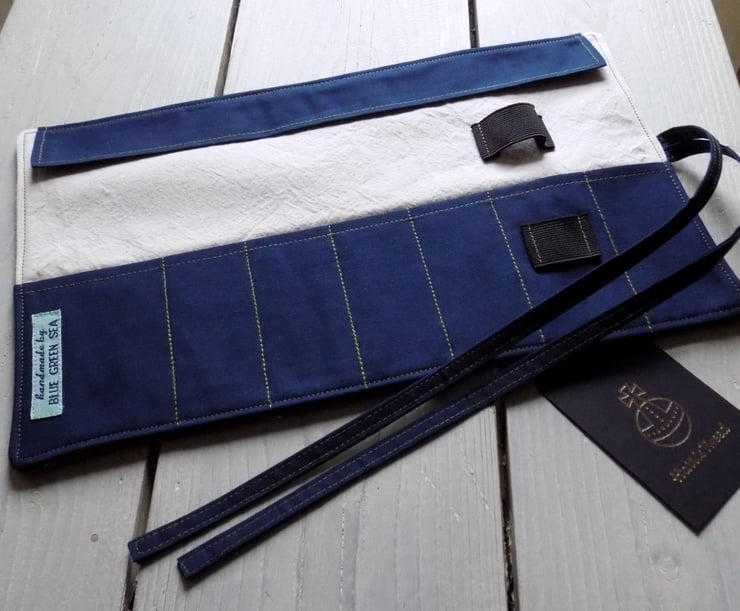 Dimensions: approximately 33cm wide x 20cm high x (13" x 7.75"). The exterior fabric is Harris Tweed and the lining is natural calico cotton with a navy blue cotton pocket approximately 10cm (4") deep which runs the full width of the wrap and is divided into sections for pencils, pens, tools or accessories. A matching top flap protects the pencils and prevents them falling out when the wrap is rolled up. Exterior and lining fabrics are fully interfaced for strength and durability. There are strips of strong elastic to hold eraser and pencil sharpener in place. The roll is secured with two navy blue cotton straps.