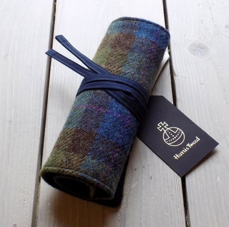 Harris Tweed pencils roll/wrap: tartan weave in blue, olive green and dark brown, with violet and tan overcheck. Suitable for pens, pencils, makeup brushes or craft items such as crochet hooks.
