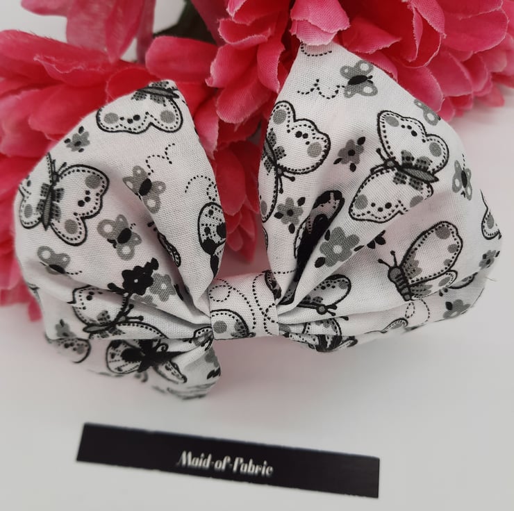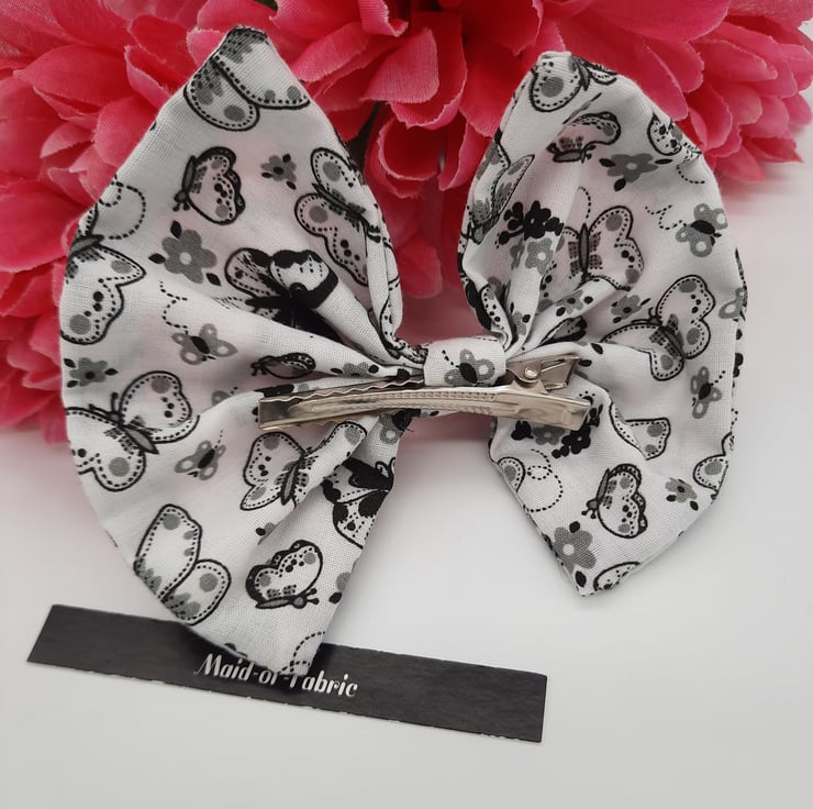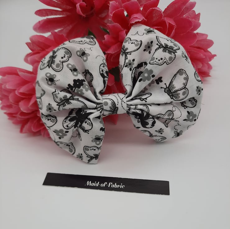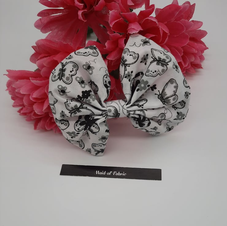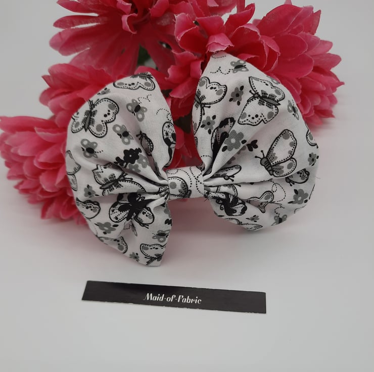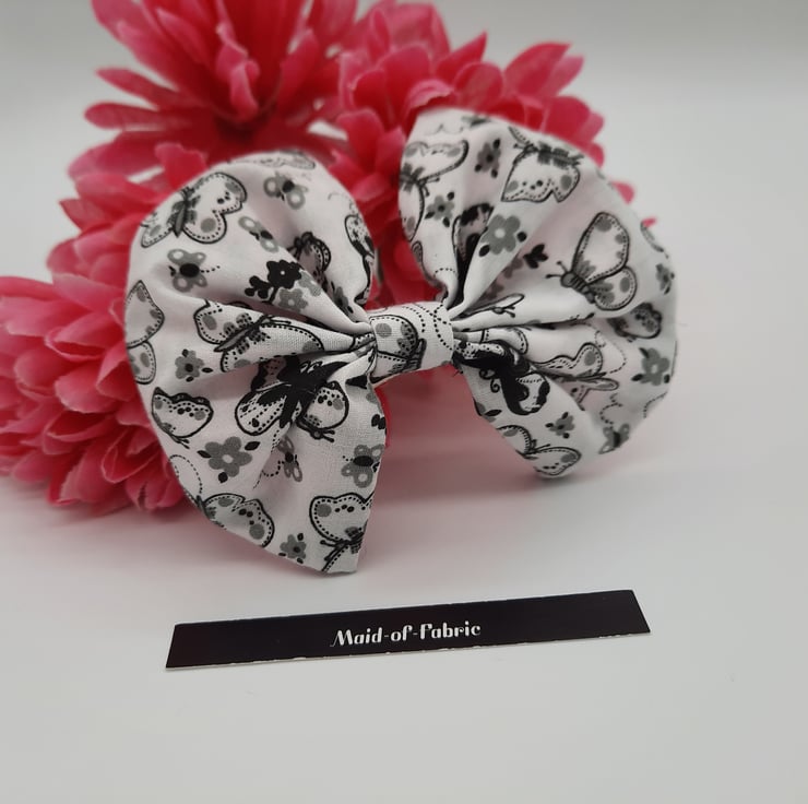 The bow measures 5" x 2.5" and is attached to a silver hair slide.