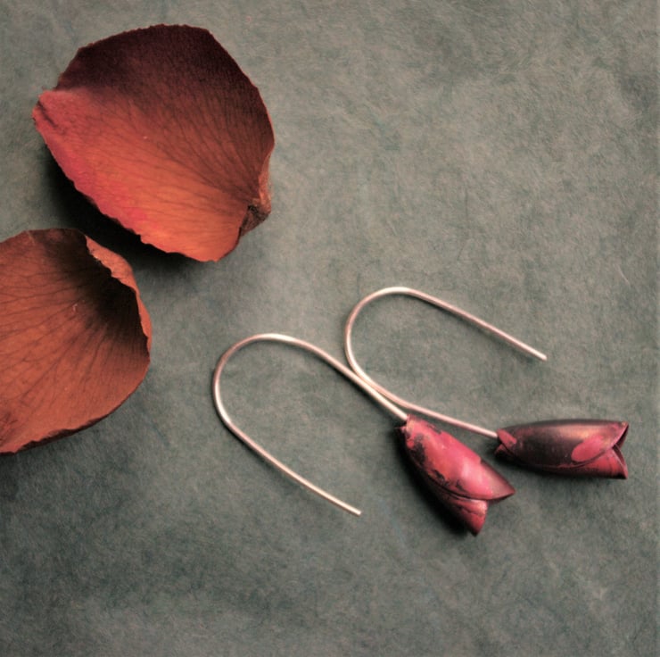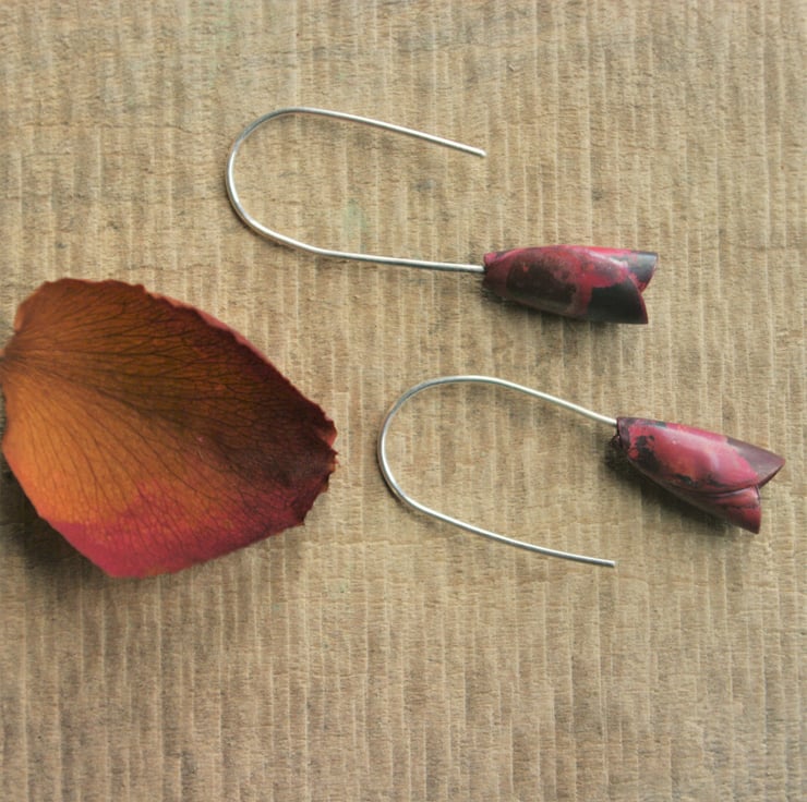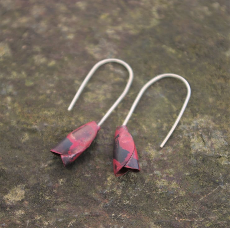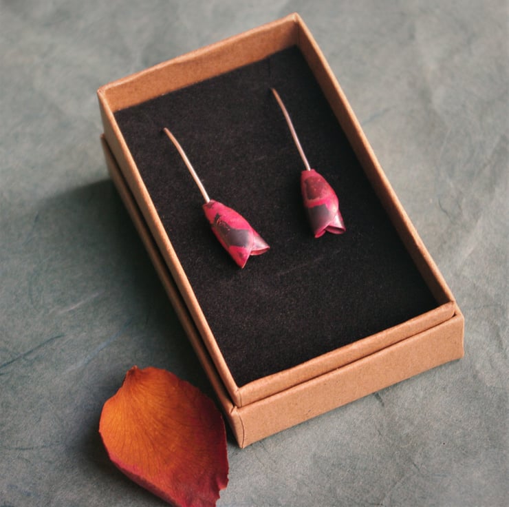 Rosebud inspired earrings made from folded , heated copper which dangle 40mm /1.5 inches. The ear hooks are handmade with sterling silver and have a silver blob at the end to stop the rosebud from falling off. The copper has gained deeper reds, pinks and purple colours in the copper due to a heating technique and are more vibrant with light shining on them. The colours are preserved with an impregnating wax.