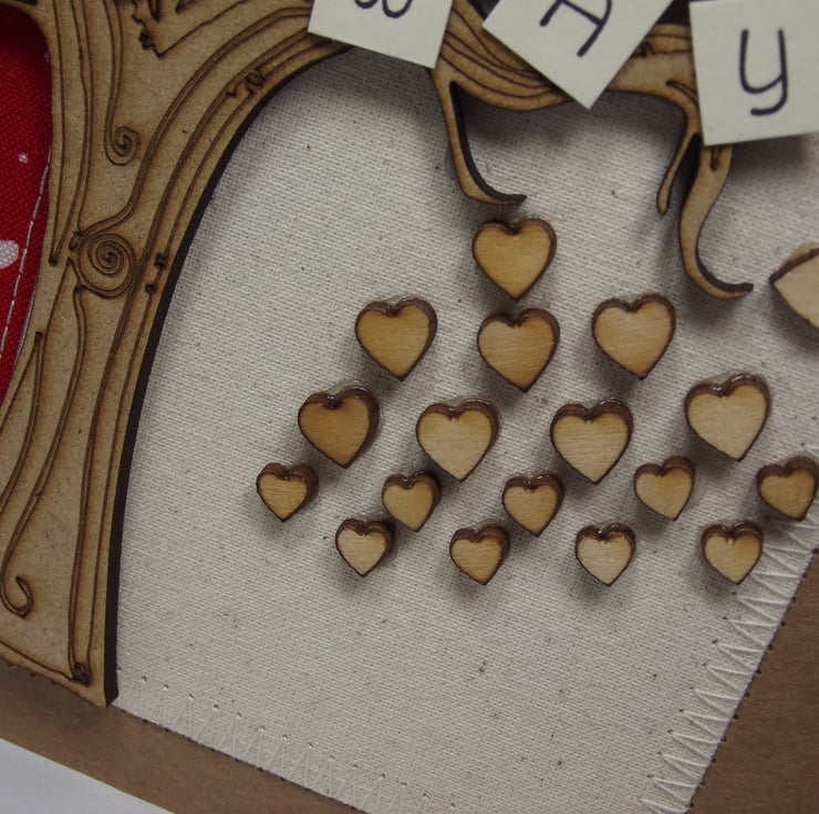 I have made the background of the card from fabric.The tree and hearts are wooden and I have added a handmade greeting.