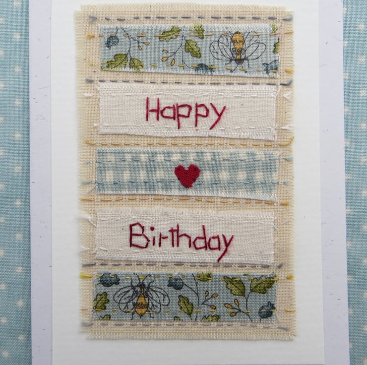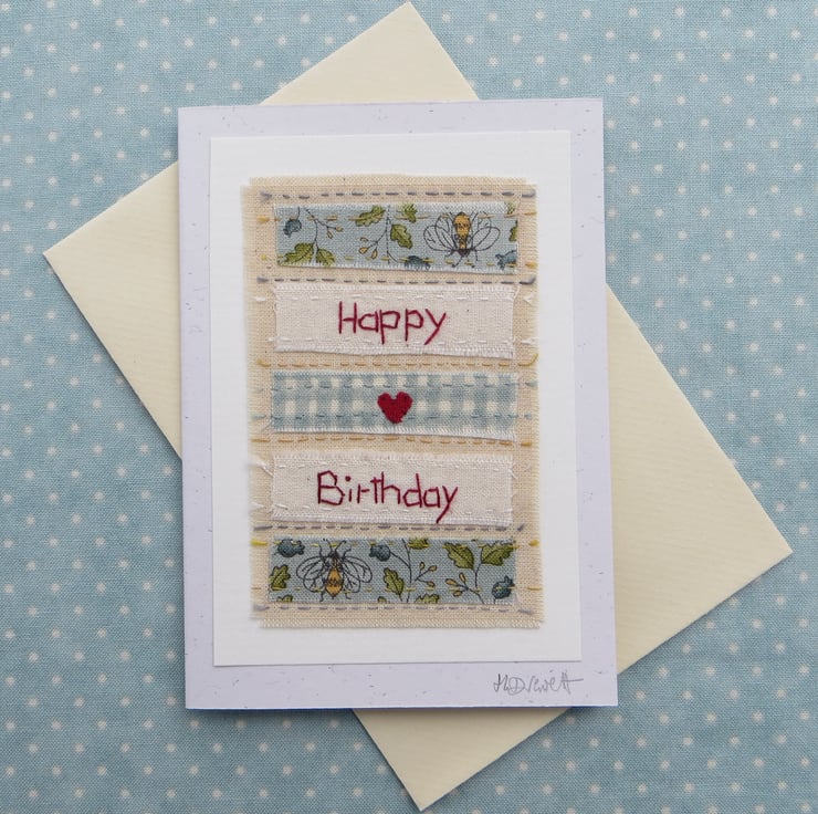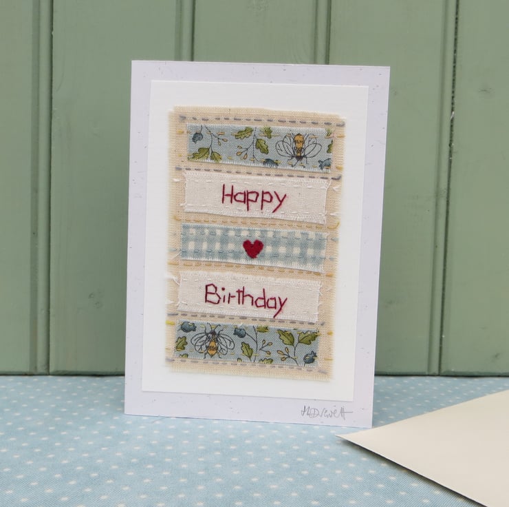 This is a small greeting card featuring a unique hand-stitched miniature applique with embroidered details. I have hand-stitched the words Happy Birthday to plain cotton fabric, adding a pretty cotton print with bees, adding a tiny red applique heart in the centre.