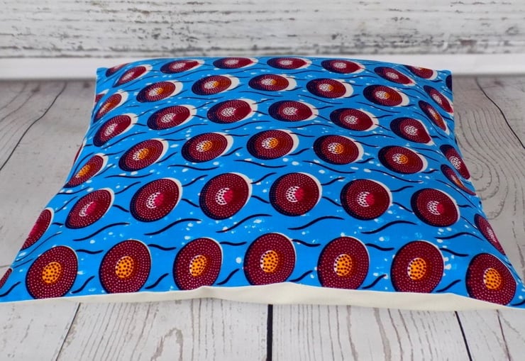 African wax print cushion cover: burgundy, White, deep pink and yellow disks on bright blue. Good quality 100% cotton fabric. Backed with natural calico cotton. Envelope-style closure.