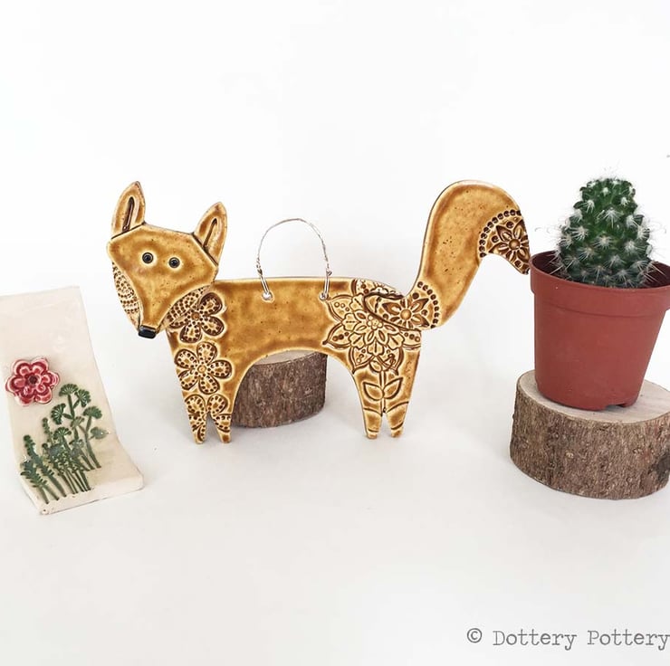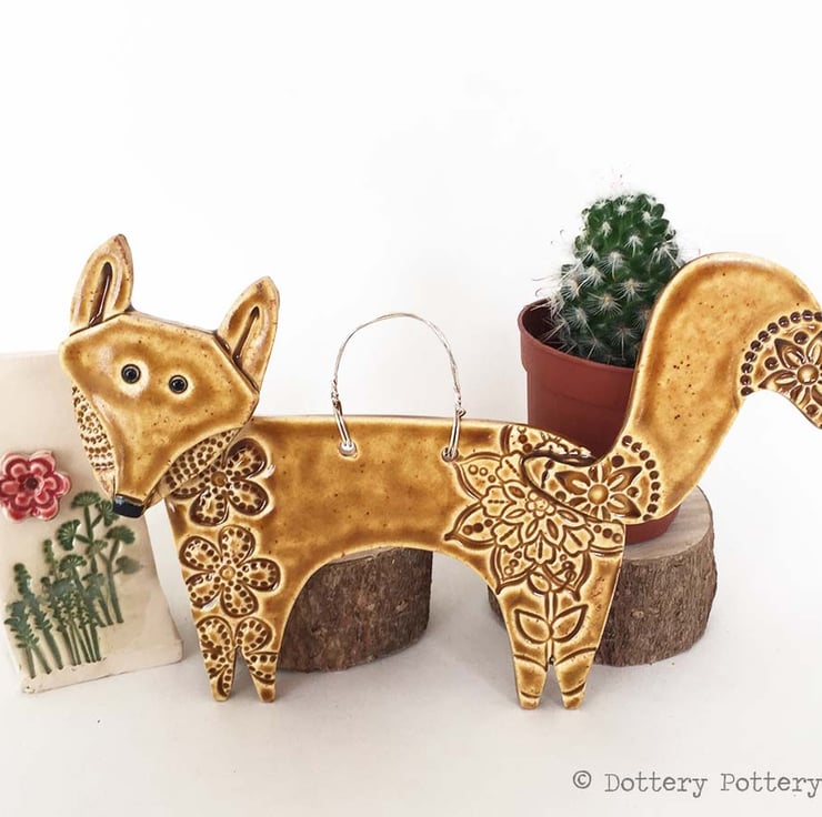 This cute little fox is made from white earthenware clay and decorated in a folk art style.