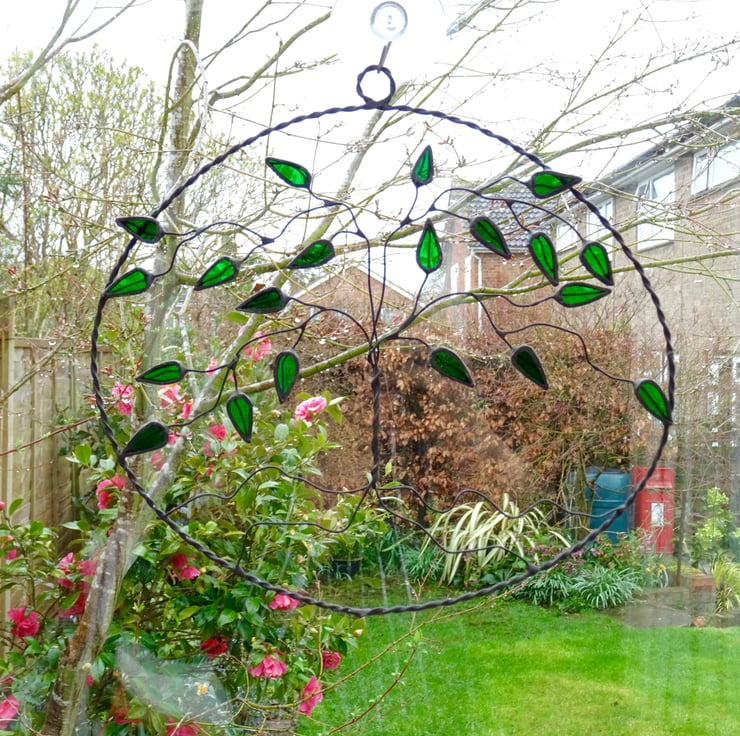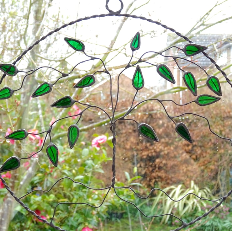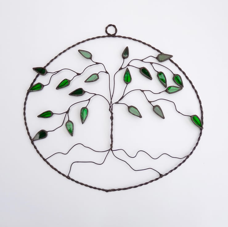 Each piece of glass has been hand cut, ground, foiled and tined before being soldered on to a tree made from twisted wire. The wire oval has been made from twisted tinned copper wire. Once soldered together a patina ha been applied to blacked the solder. The piece has then been washed and polished.